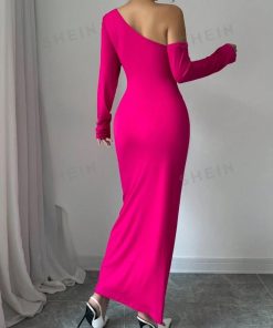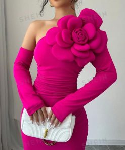فستان نسائي طويل أنيق بلون فوشيا ، عصري وفريد من نوعه. تتميز بقصة كافية وتبرز القوام بشكل أنثوي، مع تفاصيل مثل وردة كبيرة بارزة على الكتف، كاملة لمسة من الفخامة. وبعد أن تحللت مسافة طويلة على جهة واحدة، بينما جاءت بعدها ليلتحق بالكتف، مما يضفي جسماً بين المرأة والرقي.