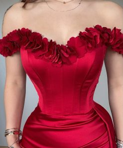 الفستان أنيق وجذاب باللون الأحمر القرمزي، مصمم بأسلوب كلاسيكي عصري يعزز الأنوثة. يتميز بقصة الكورسيه التي تحدد الخصر بشكل مثالي، مع تصميم مكشوف للأكتاف مزين بزهور بارزة على الحواف، مما يضفي لمسة رومانسية. التنورة منسدلة بقماش ساتان ناعم مع تفاصيل درابيه جانبية تضيف لمسة فاخرة. هذا الفستان مثالي للمناسبات الراقية والسهرات، حيث يجمع بين الأنوثة والفخامة في تصميم واحد.