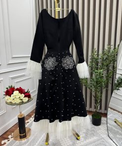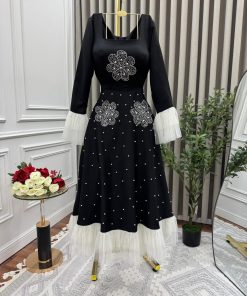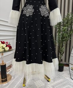 الفستان أنيق وفاخر يجمع بين اللونين الأسود والأبيض. يتميز بتصميم واسع بقصة A-line مزينة بتطريزات زهرية باللون الأبيض عند الخصر، مع لمسات من اللؤلؤ المتناثر على القماش. الأكمام منفوشة وشفافة مصنوعة من التول الأبيض، مما يضفي عليه لمسة رومانسية وفخمة. كما أن تنورته مزينة بطبقات من التول الأبيض الظاهر من الأسفل، مما يمنحه مظهرًا راقيًا وملكيًا.