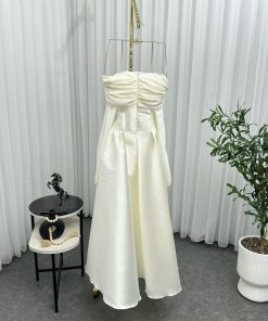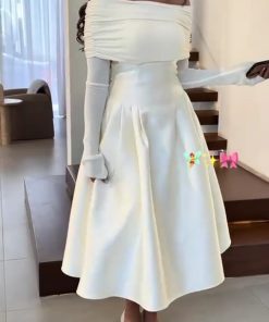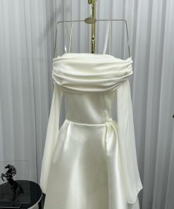 فستان أنيق وفخم بلون أبيض أو أوف وايت، يتميز بتصميم مكشوف الأكتاف مع أكمام طويلة تمتد إلى الكفين، مما يمنحه مظهرًا راقيًا وأنثويًا. الجزء العلوي من الفستان مصمم بقماش مجعد قليلاً عند منطقة الصدر، بينما الجزء السفلي واسع ومنفوش قليلًا، بطول ميدي يصل أسفل الركبة.