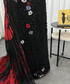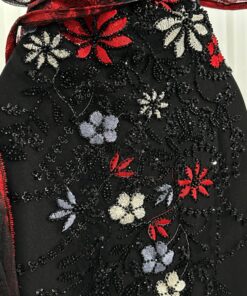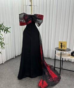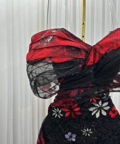 تميّزي بإطلالة أنثوية راقية مع هذا الفستان الساحر بتصميم أوف شولدر باللونين الأسود والأحمر. يتميز الفستان بتطريز ناعم لزهور متعددة الألوان تضيف لمسة حيوية إلى قاعدة سوداء أنيقة، بينما تضفي الطبقة العلوية من التول الأحمر والأسود لمسة درامية جذابة. القَصة الضيقة تُبرز جمال القوام، والتفاصيل الفاخرة تجعل من هذا الفستان الخيار الأمثل للمناسبات الراقية والسهرات الفخمة.