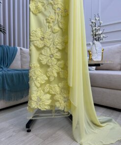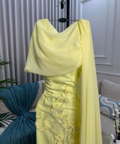فستان سهرة فاخر باللون الأصفر الباستيل يعكس إشراقة وأناقة لا مثيل لها. يتميز التصميم بقماش شيفون انسيابي مع كتف واحد منسدل بطريقة راقية، يضفي لمسة ملكية على الإطلالة. الفستان مزين بتطريز يدوي بارز على شكل ورود ثلاثية الأبعاد تمتد على طول التصميم، مما يمنحه بعداً جمالياً أنثوياً فريداً.