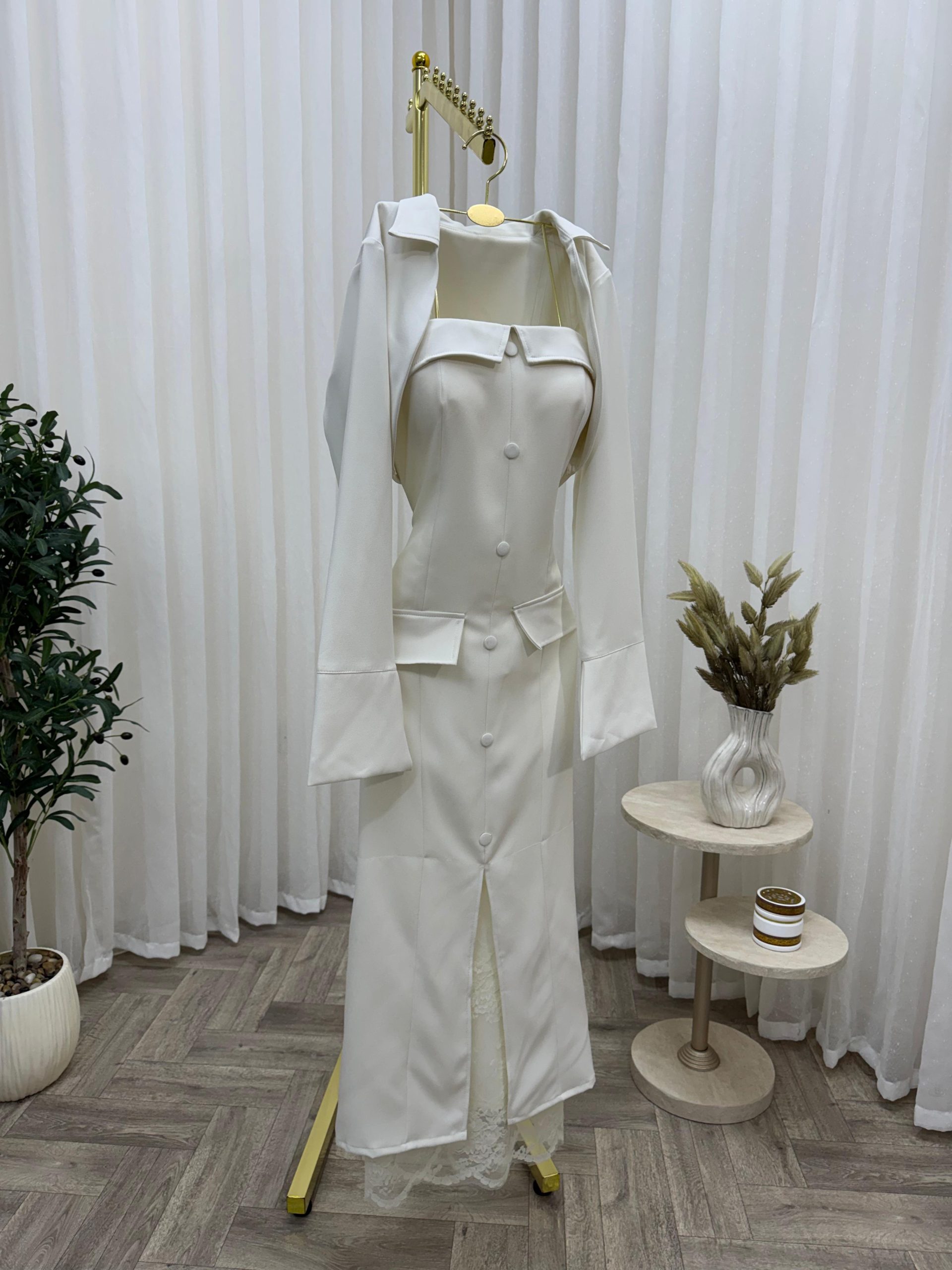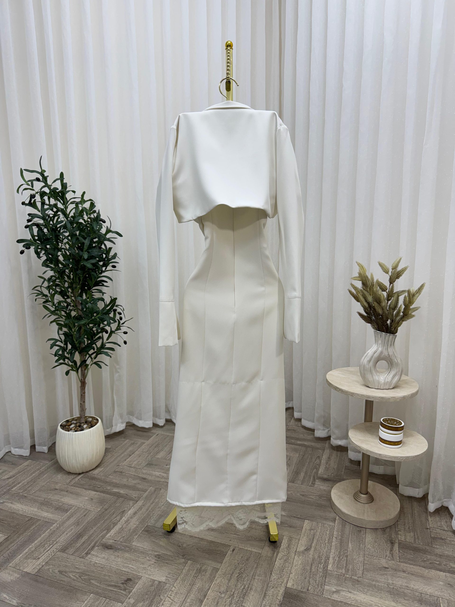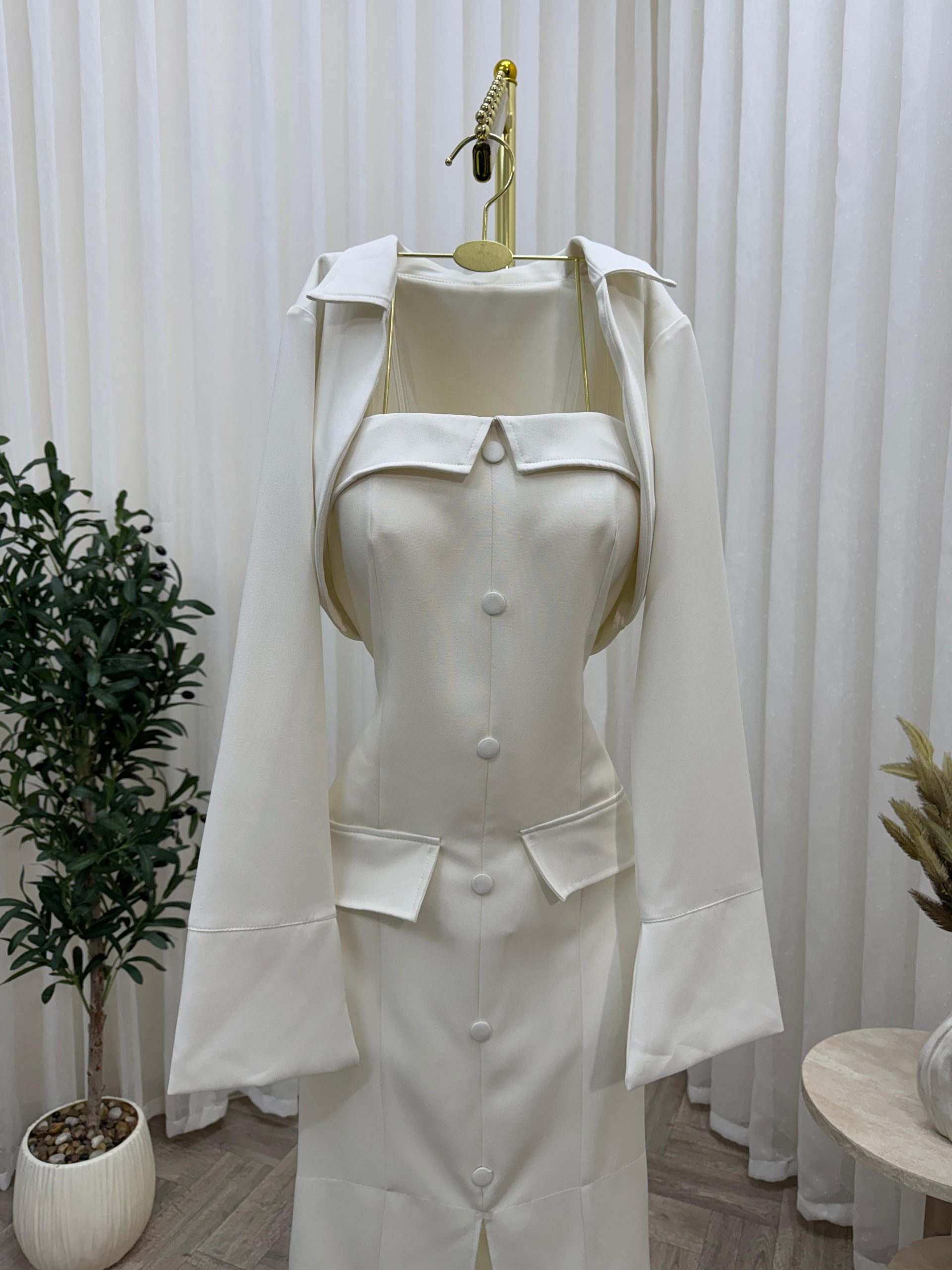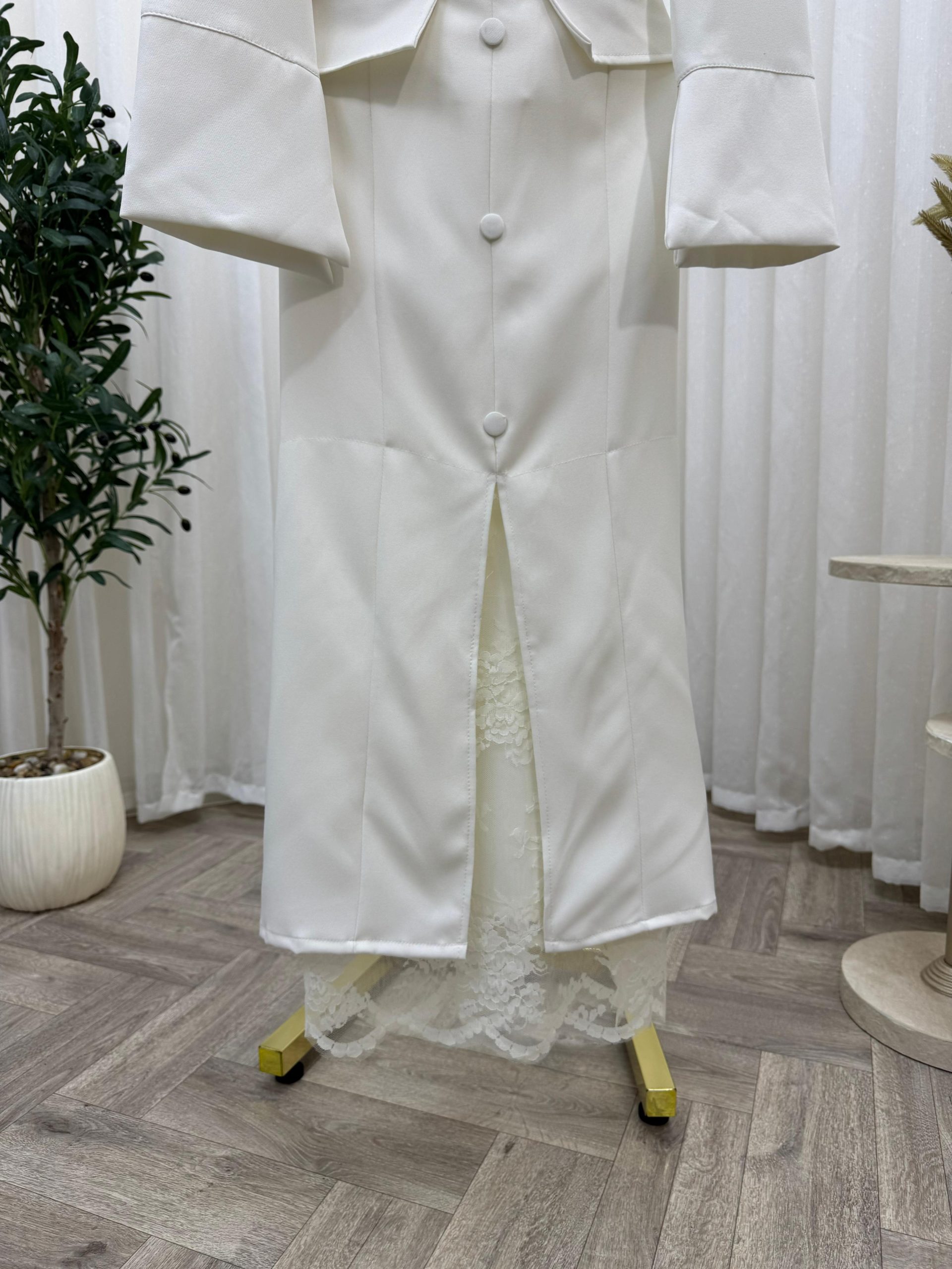 يأتي الفستان بأكمام طويلة وتصميم صدر مربع أنيق يبرز جمال الإطلالة، مع أزرار أمامية أنيقة تضيف طابعاً كلاسيكياً راقياً. كما أن القصة الضيقة عند الخصر تمنحك مظهراً أنثوياً جذاباً، بينما يضيف تفصيل الدانتيل الناعم في أسفل الفستان لمسة فخامة مميزة.