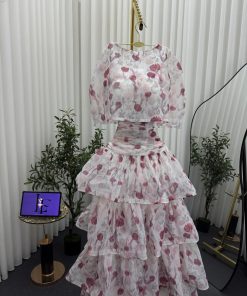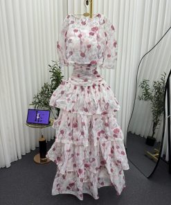 فستان أنيق باللون الأبيض مزين بنقشة وردية ناعمة يمنحك إطلالة أنثوية رقيقة ومميزة. يتميز بتصميم عصري مكوّن من قطعتين؛ بلوزة قصيرة بأكمام واسعة مع تنورة طويلة متعددة الطبقات بتفاصيل كشكش تضيف حركة وانسيابية جذابة.