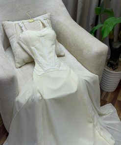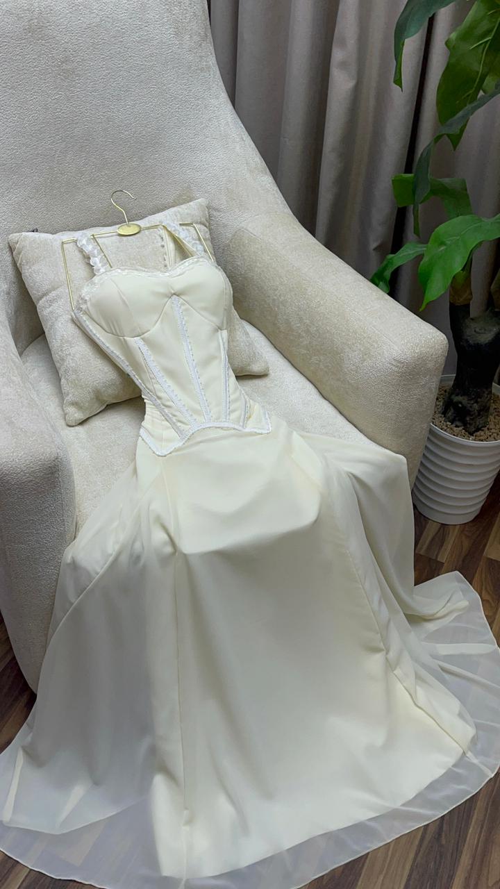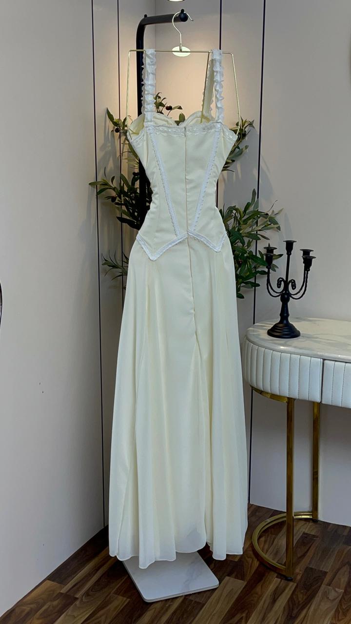 يتميز الفستان بجزء علوي كورسيه محدد يبرز جمال القوام بأسلوب أنثوي جذاب، مع حمالات رفيعة تضيف لمسة ناعمة وأنيقة. تنسدل التنورة الطويلة بقصة انسيابية خفيفة تمنحك حركة راقية ومظهرًا هادئًا يناسب أهم المناسبات.