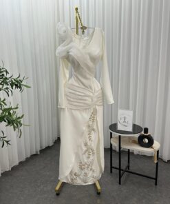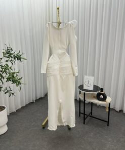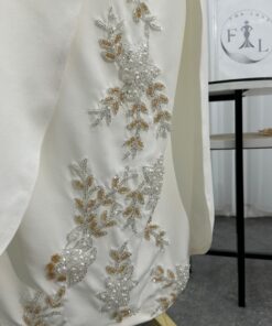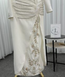 الفستان الأبيض ده مش مجرد قطعة ملابس، هو عمل فني حرفيًا. التصميم غير المتماثل عند الكتف يعطي لمسة جريئة وفريدة، بينما تضيف الخطوط المتداخلة عند الخصر لمسة أنثوية راقية. الجزء السفلي المطرز باللون الذهبي يضفي إحساس بالترف والرقي، مثالي للعروس أو السيدة الباحثة عن فستان يخطف الأنظار بكل التفاصيل.