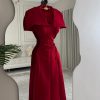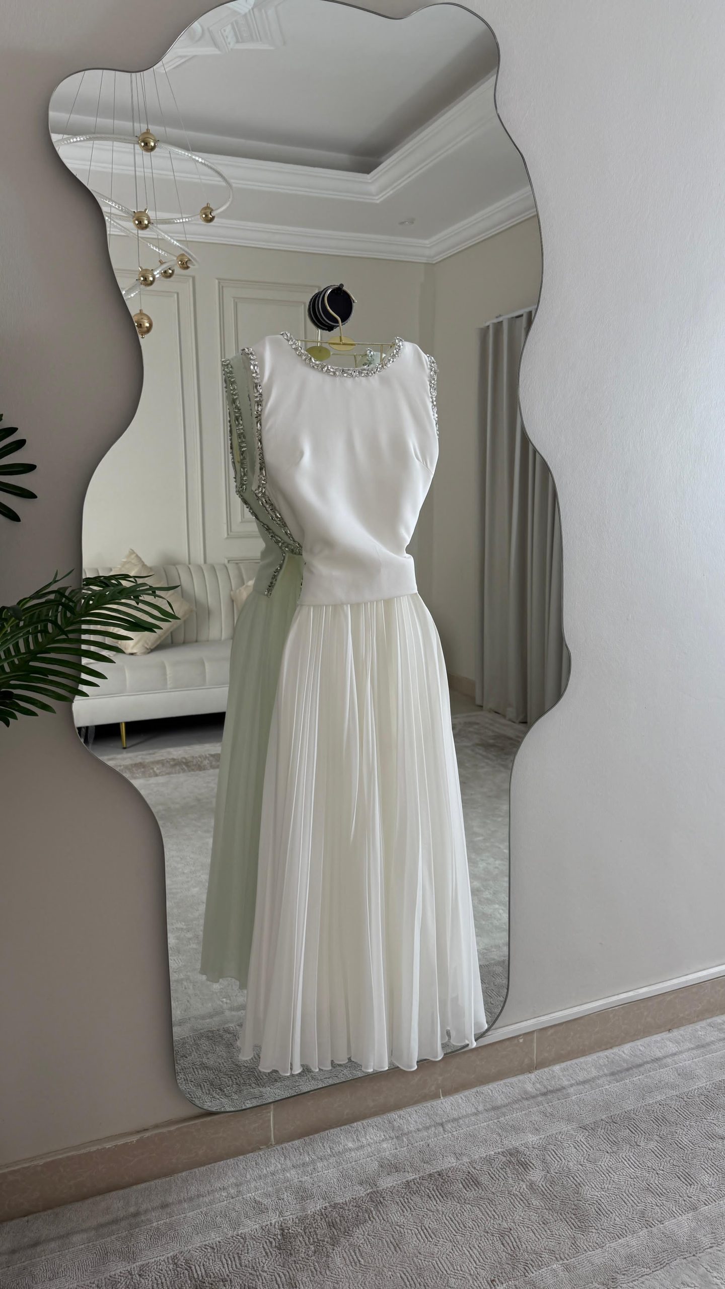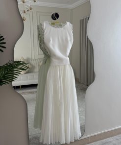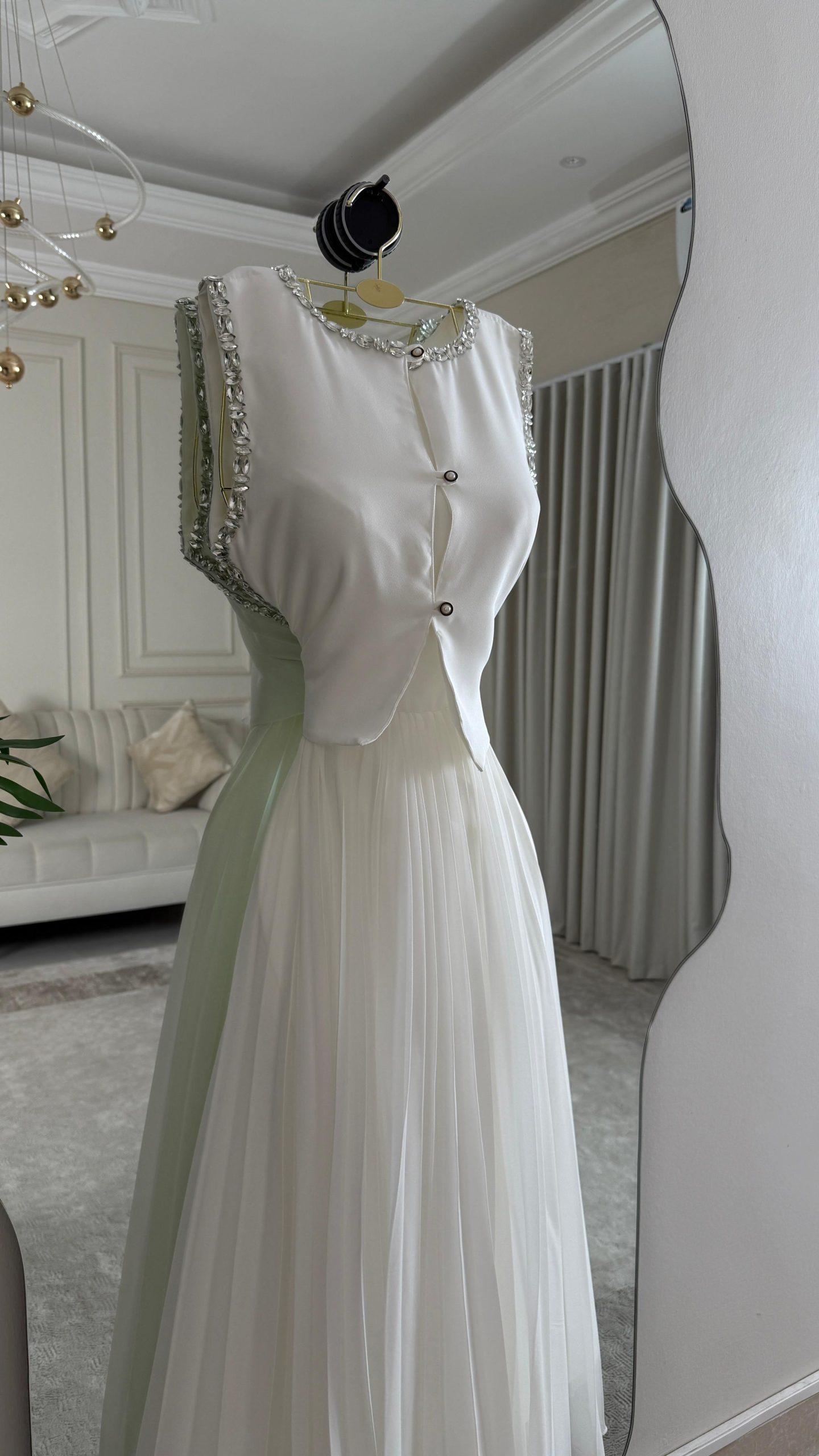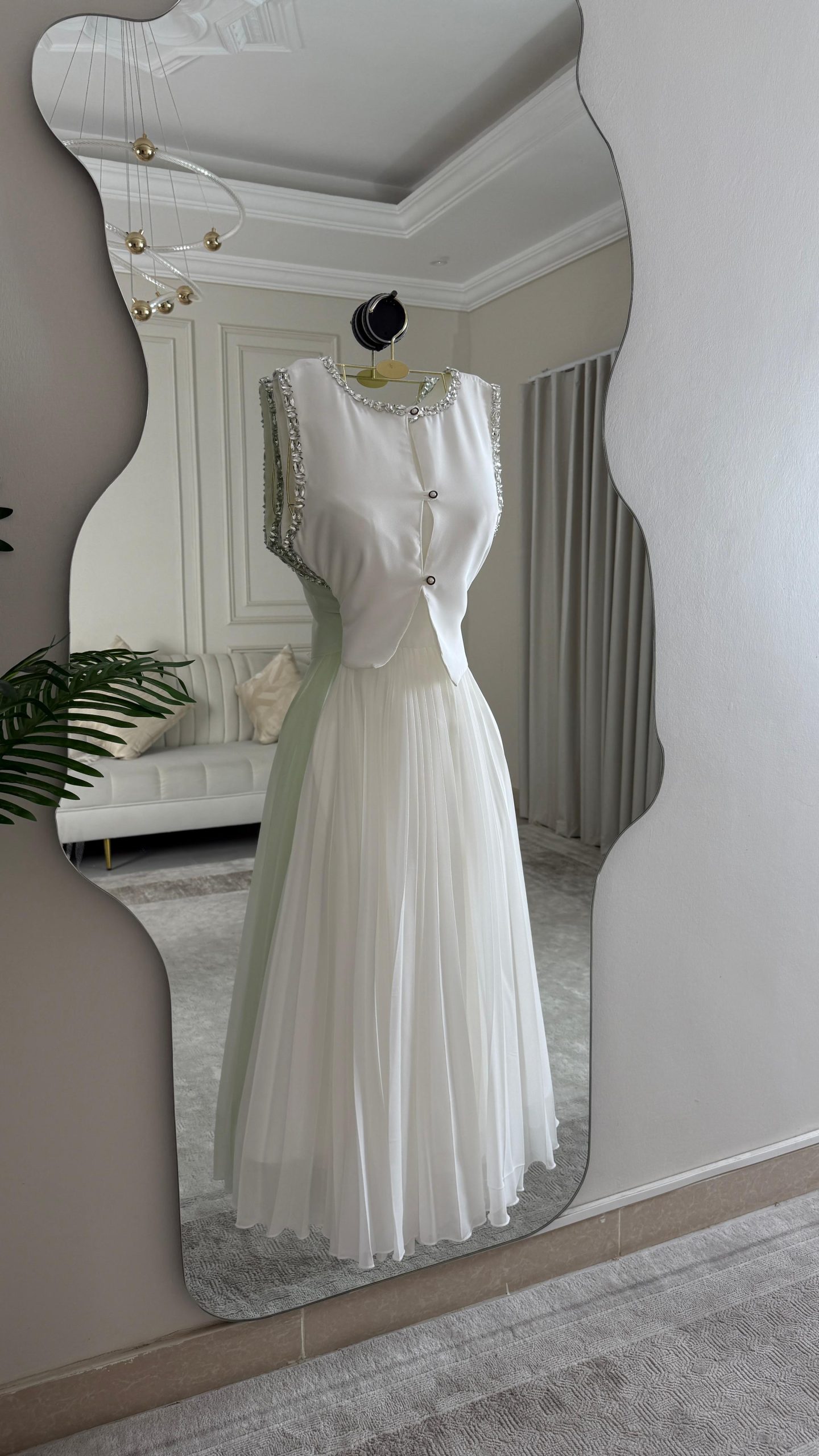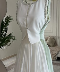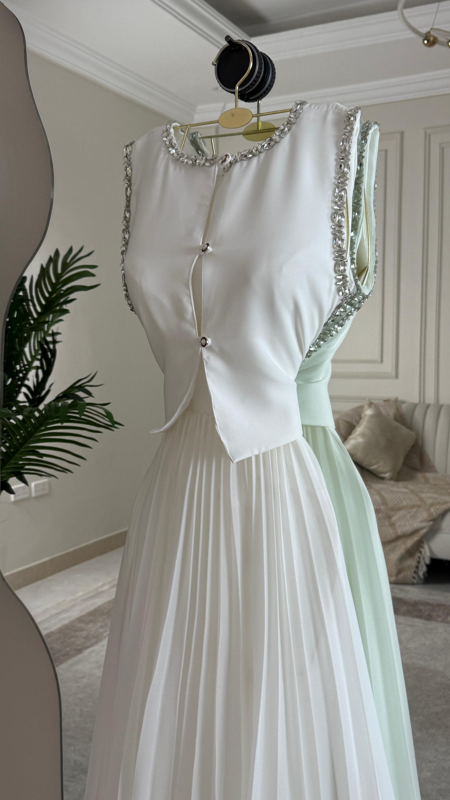 يتميز الفستان بجزء علوي أنيق بدون أكمام مزين بتفاصيل كريستال راقية حول الياقة والأكتاف، مع أزرار أمامية تضيف لمسة كلاسيكية جذابة. تنسدل التنورة بطبقات شيفون مطوية بانسيابية ناعمة تمنحك حركة خفيفة وإطلالة أنثوية ساحرة.