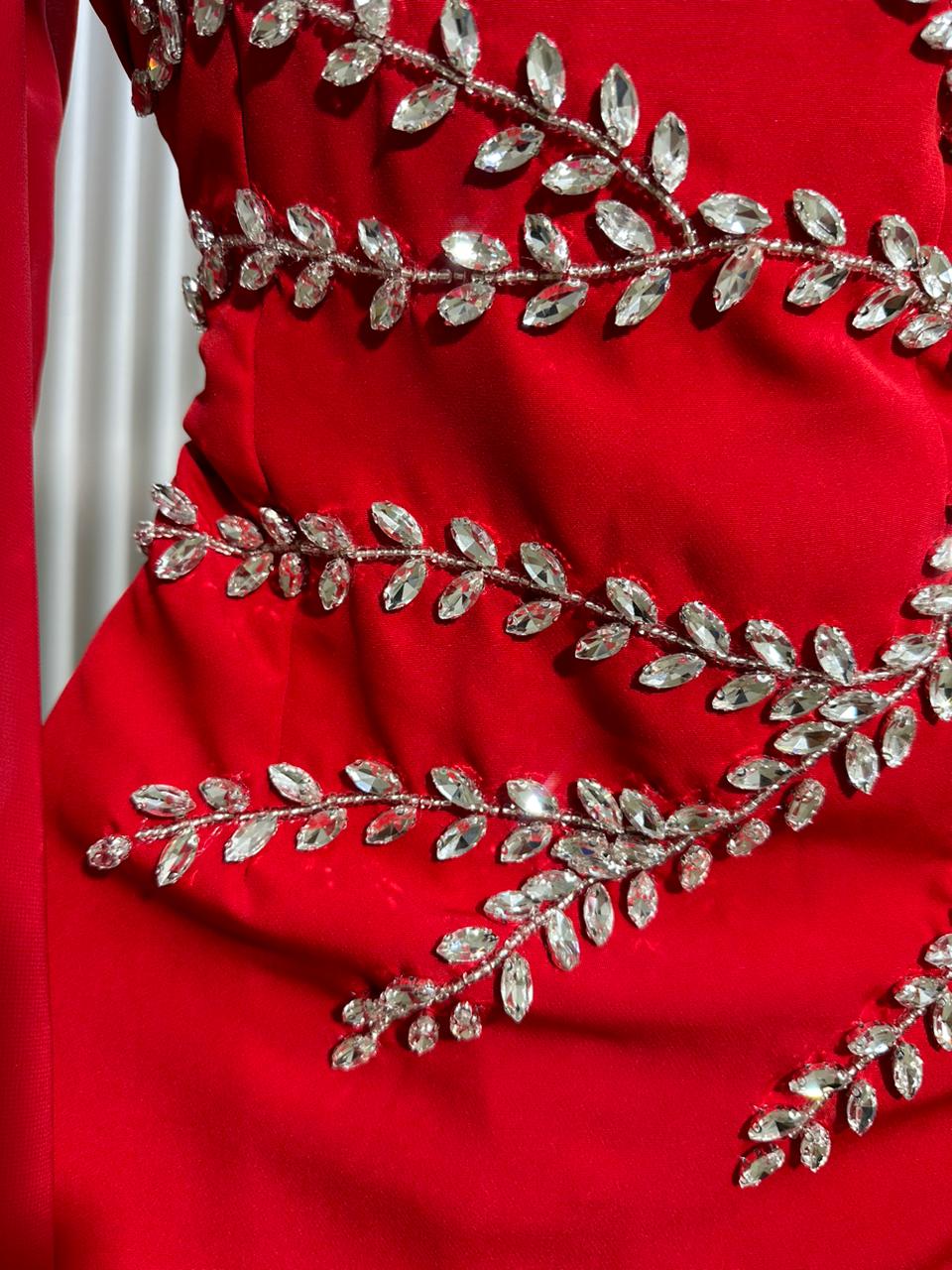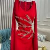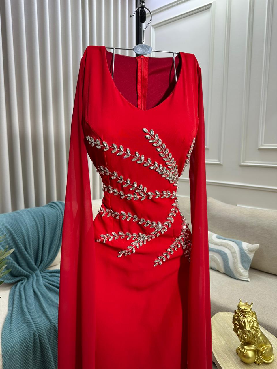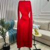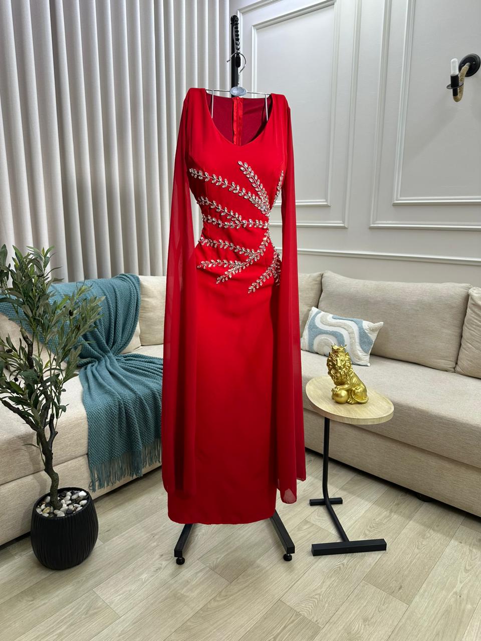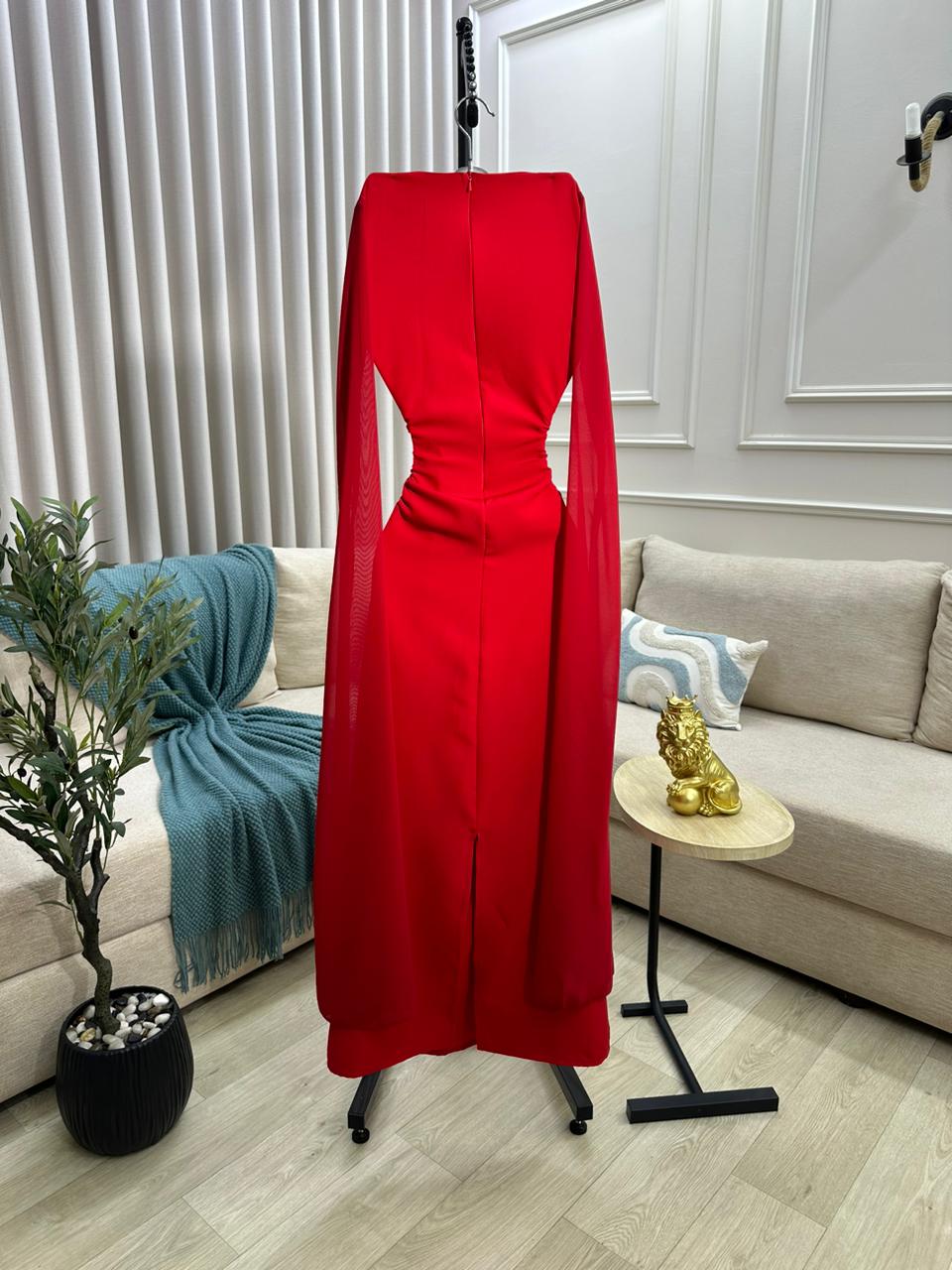 يتميز الفستان بلونه الأحمر الجريء الذي يعكس الثقة والحيوية، مما يجعله خياراً مميزاً للمناسبات الخاصة والسهرات الفاخرة. التصميم الأنيق يتميز بقصة ضيقة على الجسم تعزز من ملامحك الأنثوية، وتجمع بين البساطة والفخامة في تناغم مثالي.