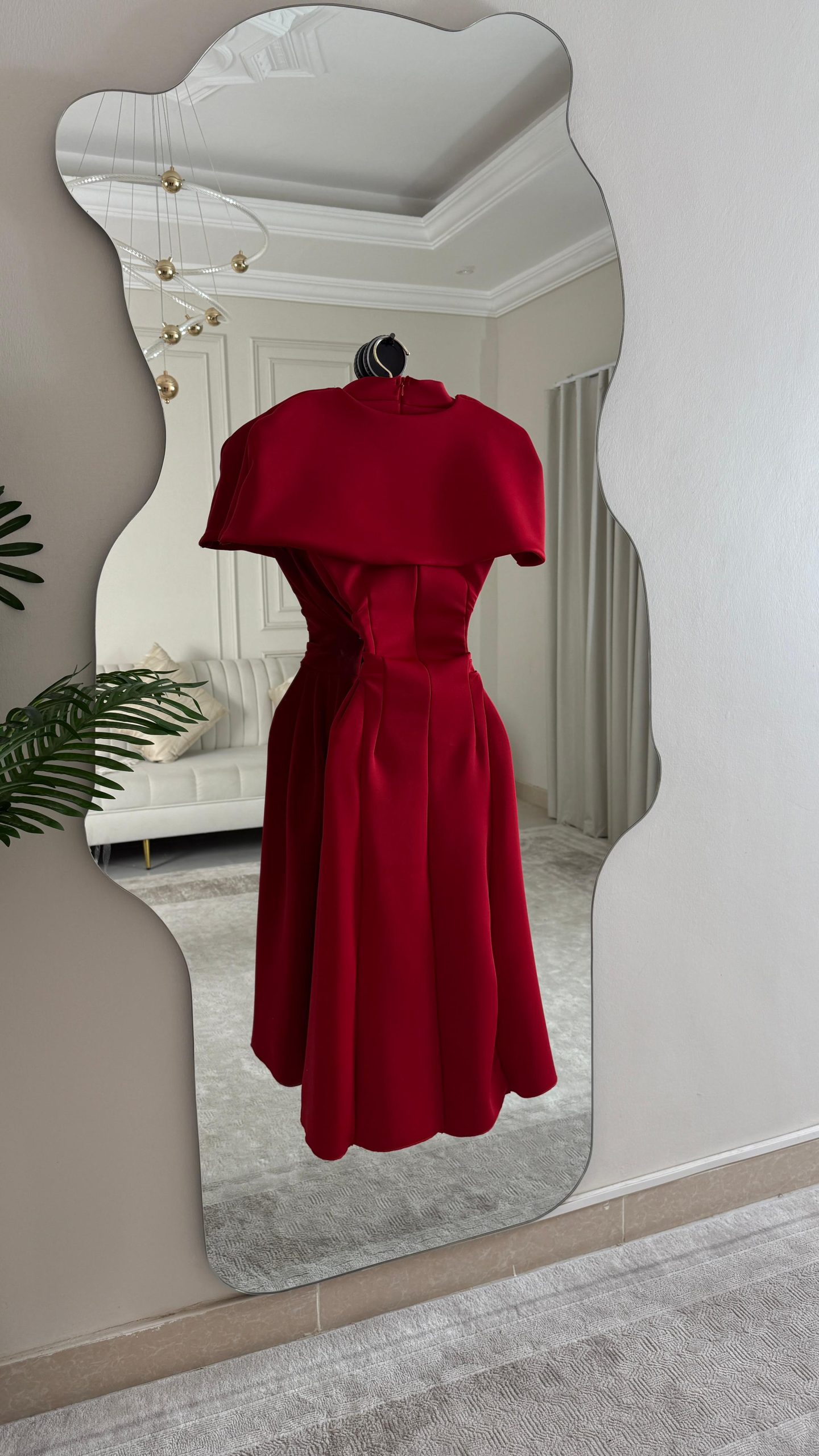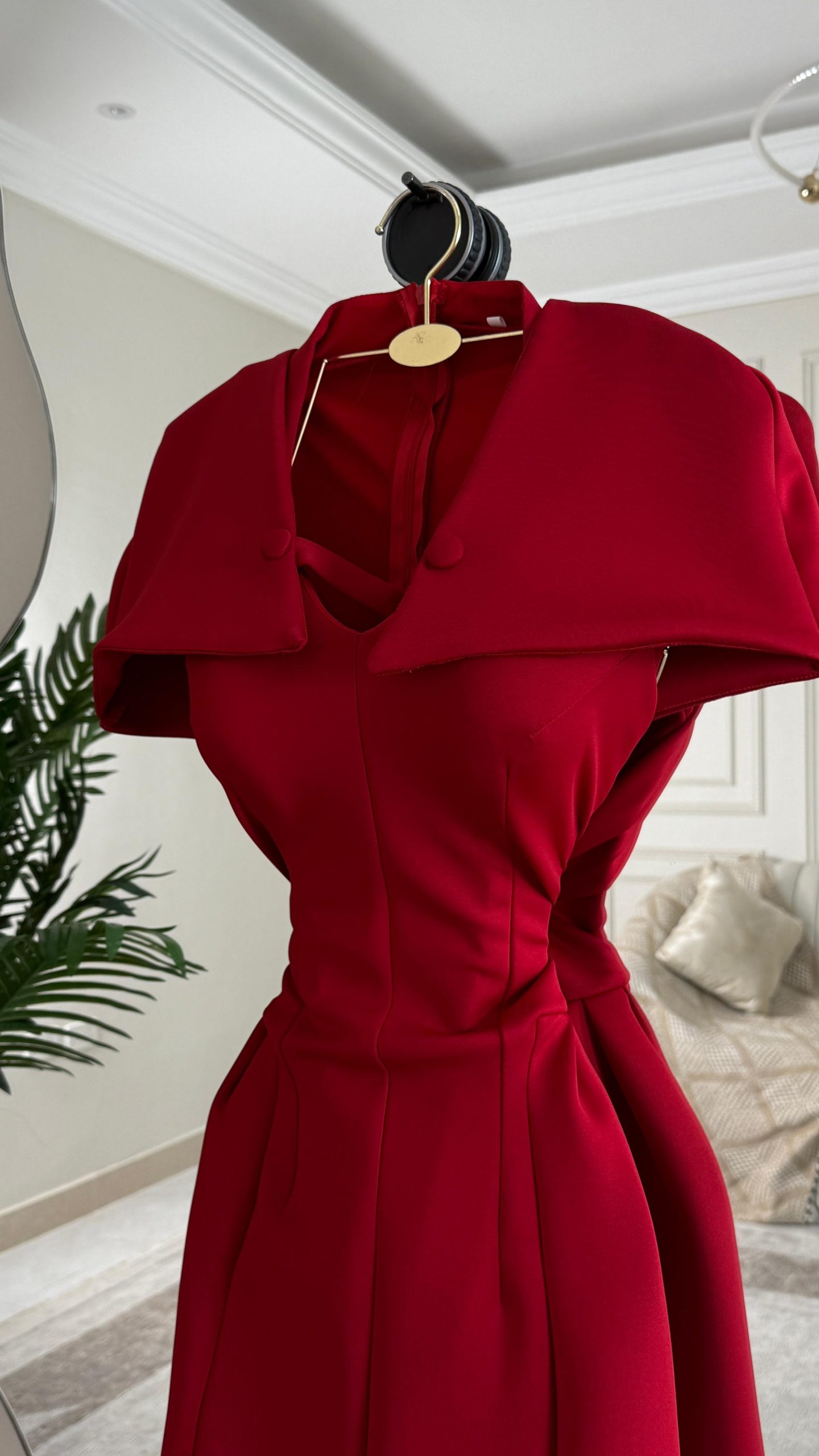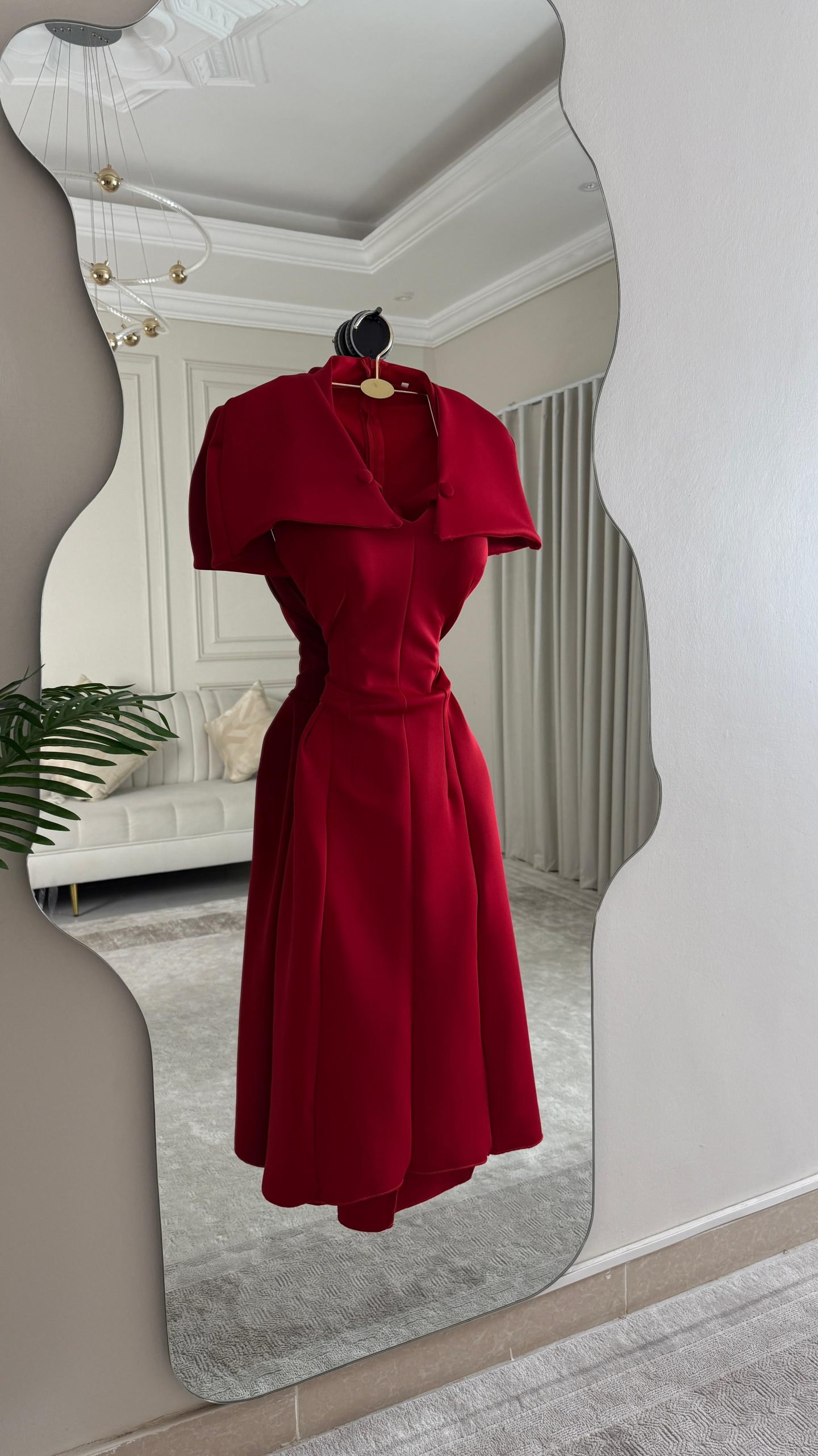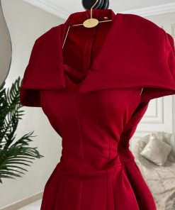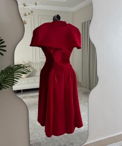 فستان أحمر ميدي بقصة كلاسيكية وياقة أنيقة