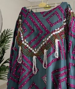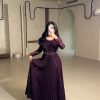 يتميز الفستان بتنورة طويلة انسيابية بقصة واسعة تمنحك حركة ناعمة وفخامة واضحة، مع طبقة علوية مزينة بتطريز هندسي لامع باللون الفوشيا يضفي لمسة عصرية راقية. التصميم المحتشم يجعله مناسبًا للمناسبات العائلية، حفلات المساء، والاستقبالات الرسمية.