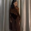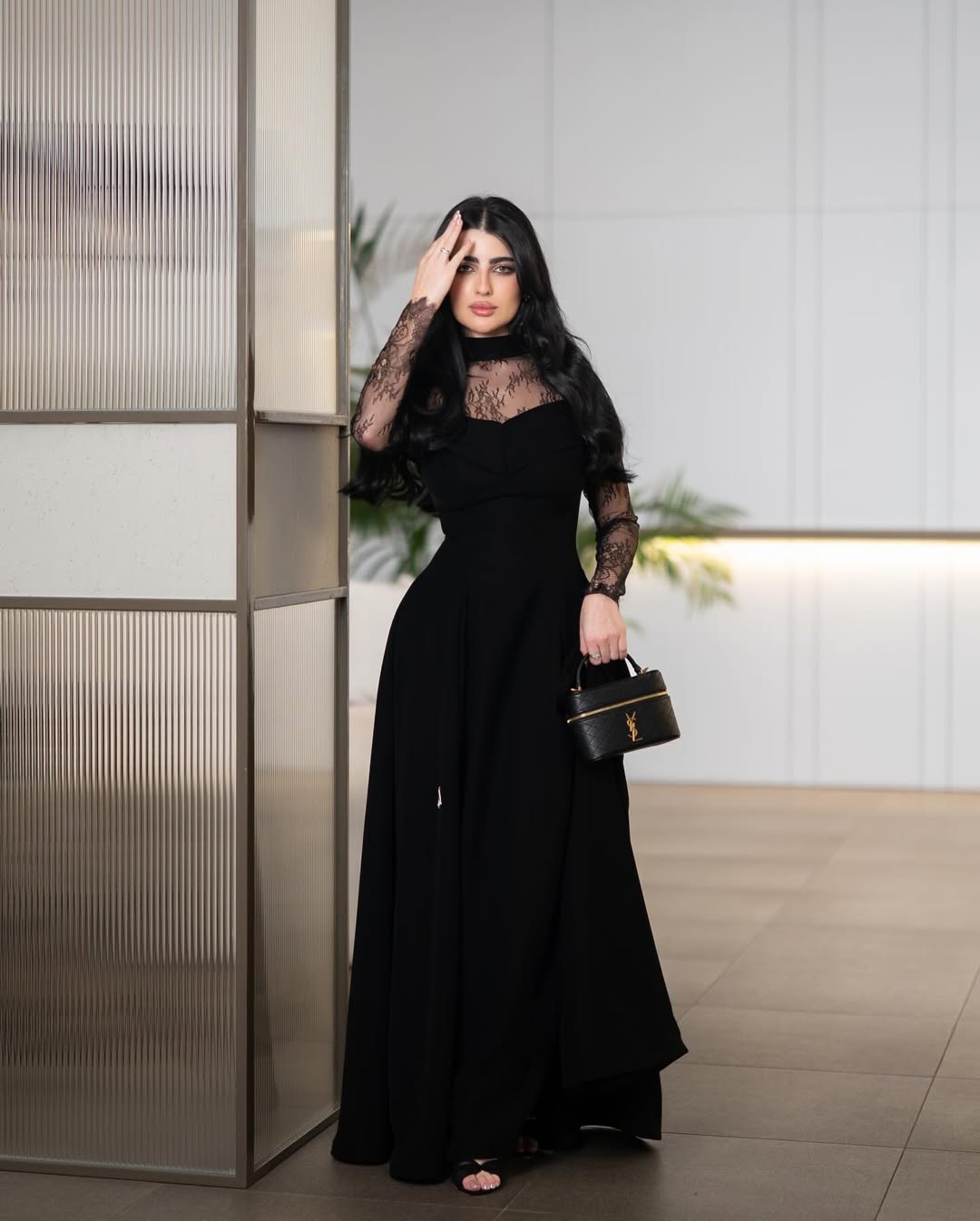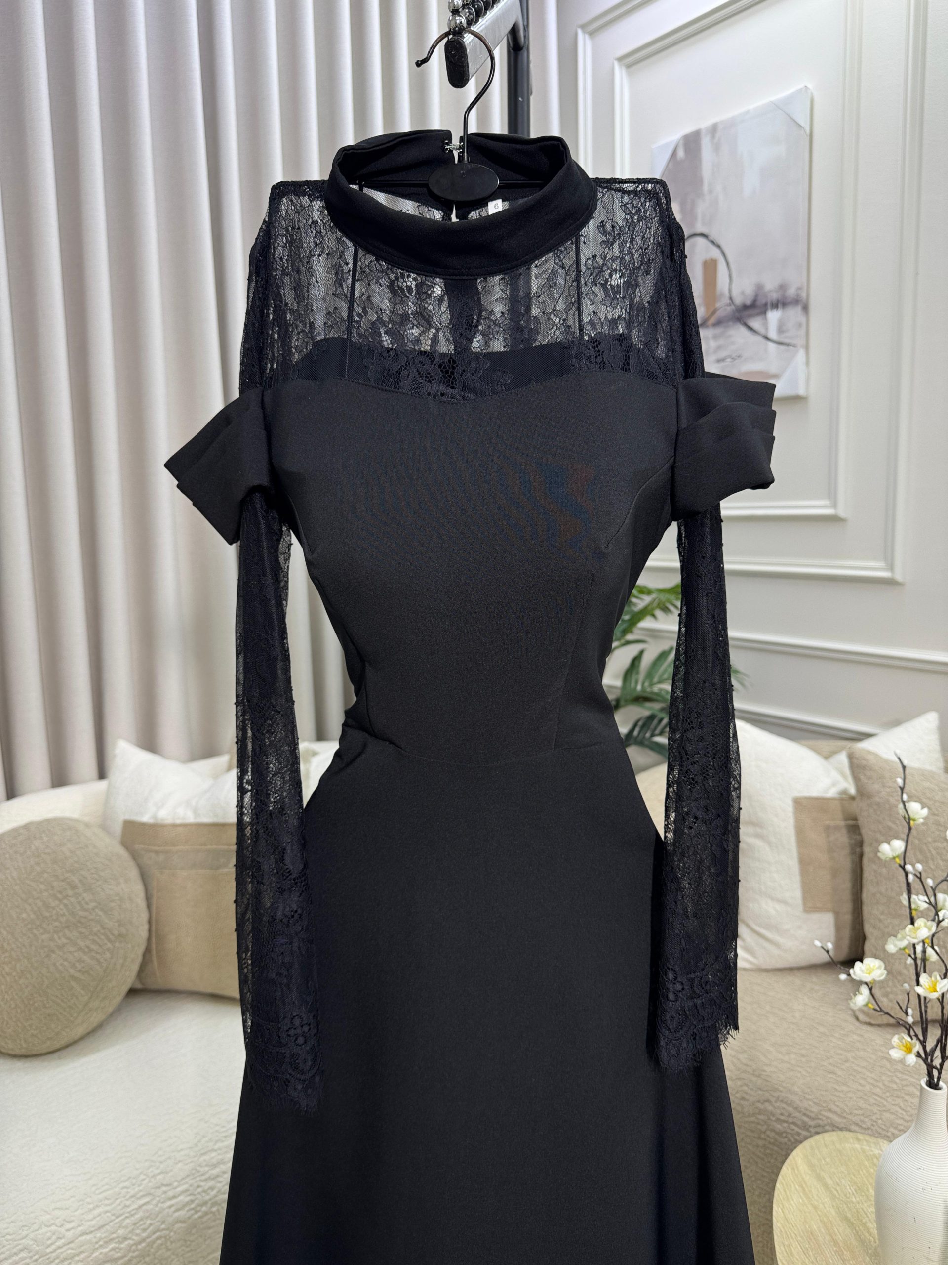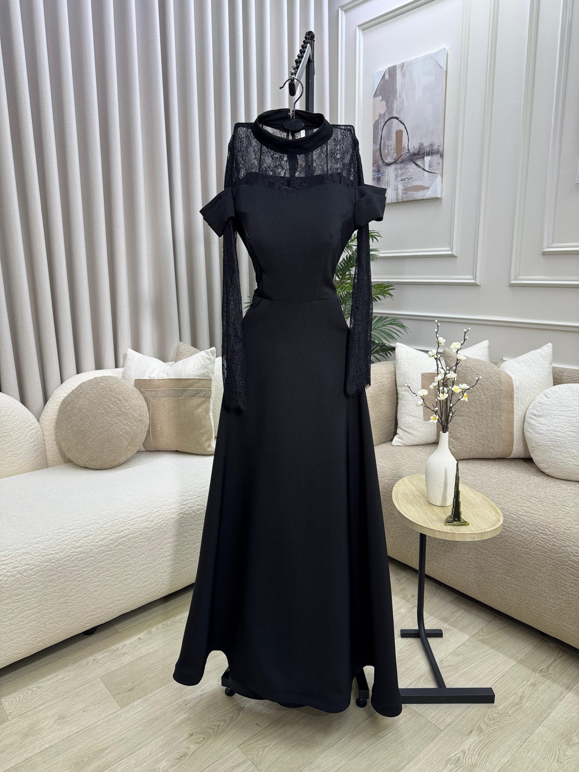 يتميز الفستان بقصة أنيقة تبرز جمال القوام، مع طبقة دانتيل شفافة ناعمة تضيف لمسة فخامة وأنوثة، بينما يمنحك اللون الأسود الكلاسيكي حضورًا قويًا لا يزول مع الزمن.