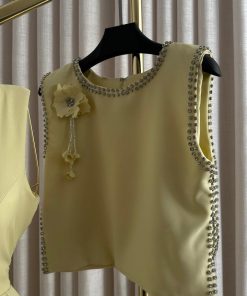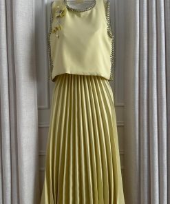فستان أنيق باللون الأصفر الفاتح يمنحك إطلالة ناعمة ومشرقة، مثالي للمناسبات النهارية والسهرات البسيطة. يتميز بقصة ميدي مع تنورة بكسرات انسيابية تضيف حركة أنثوية جميلة، مع تصميم بدون أكمام يبرز الأناقة والبساطة.