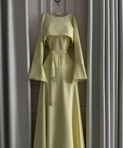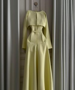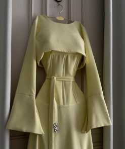 فستان طويل باللون الأصفر الفاتح بتصميم ناعم وأنيق يعكس الإشراقة والأنوثة بأسلوب راقٍ. يتميز بقصة خصر محددة مع حزام أنيق يبرز القوام، وأكمام طويلة واسعة بقصة جرس تضيف لمسة فخامة وانسيابية للتصميم.