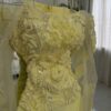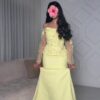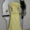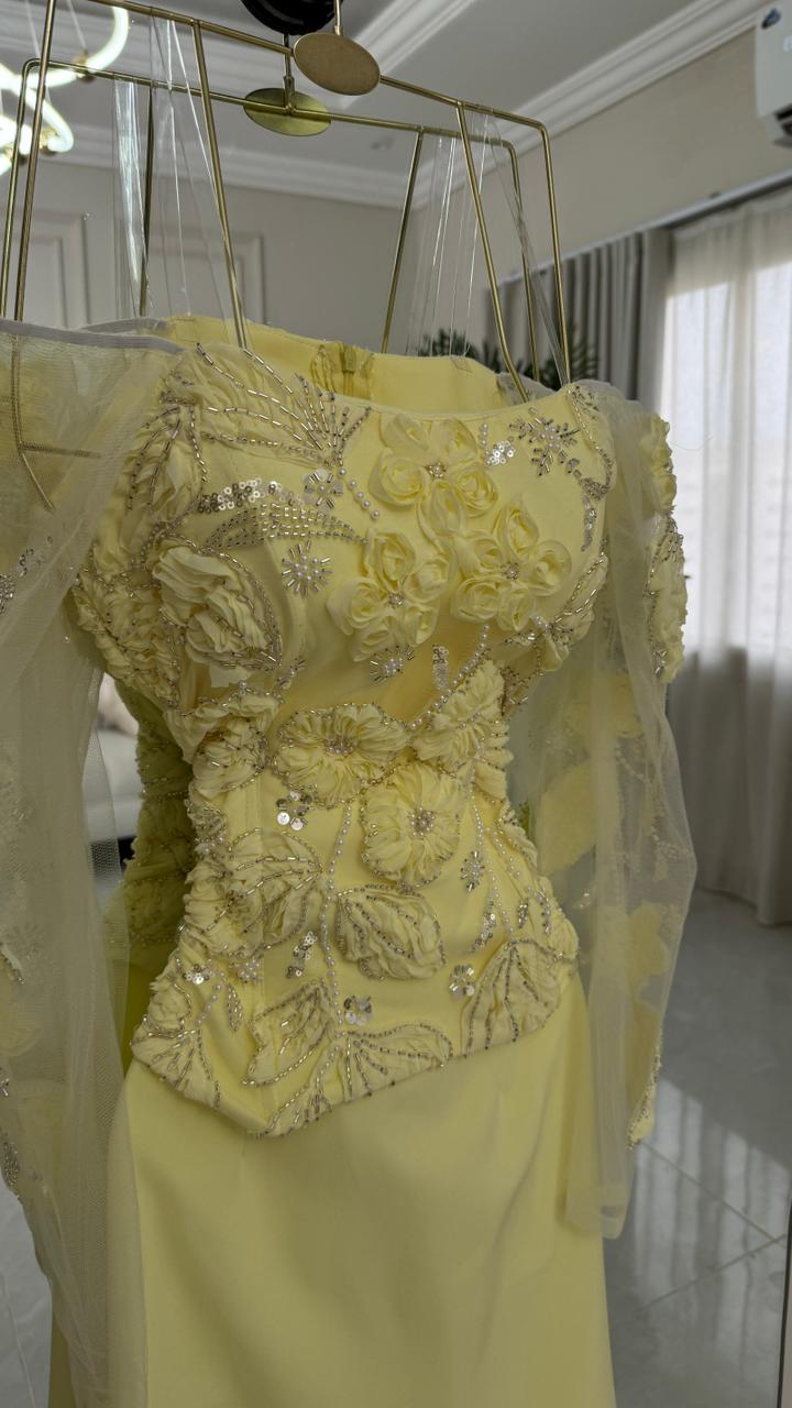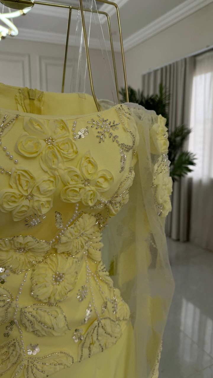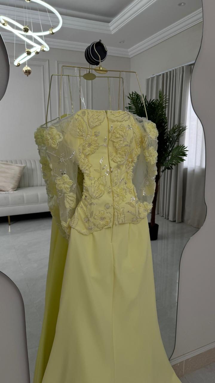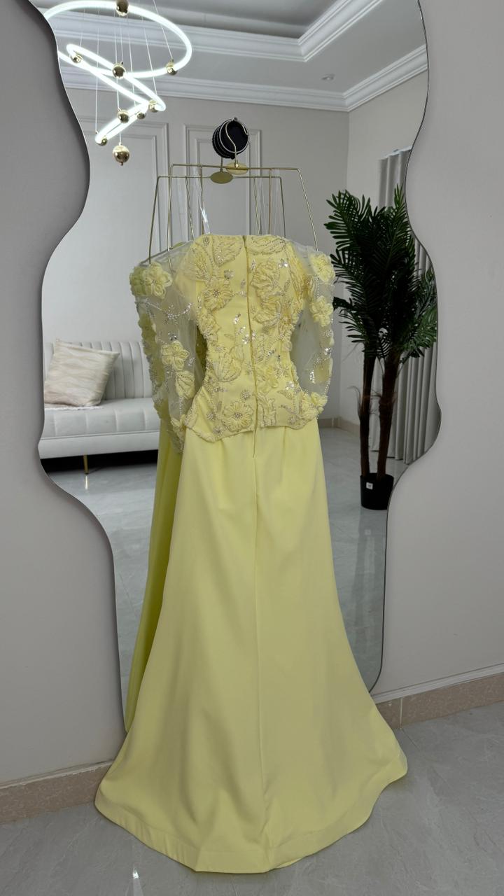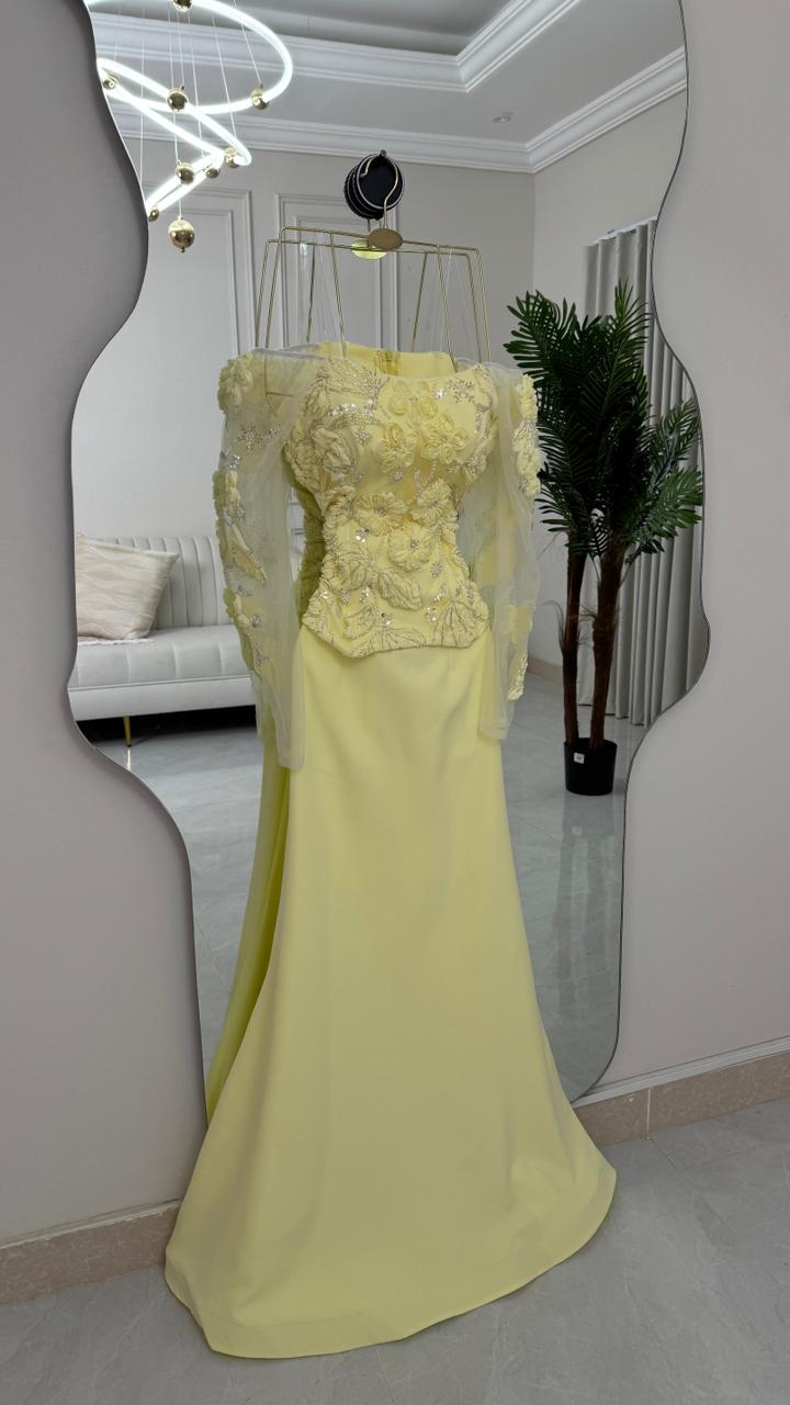 فستان أصفر فاتح مزين بتطريزات زهرية وأكمام شفافة