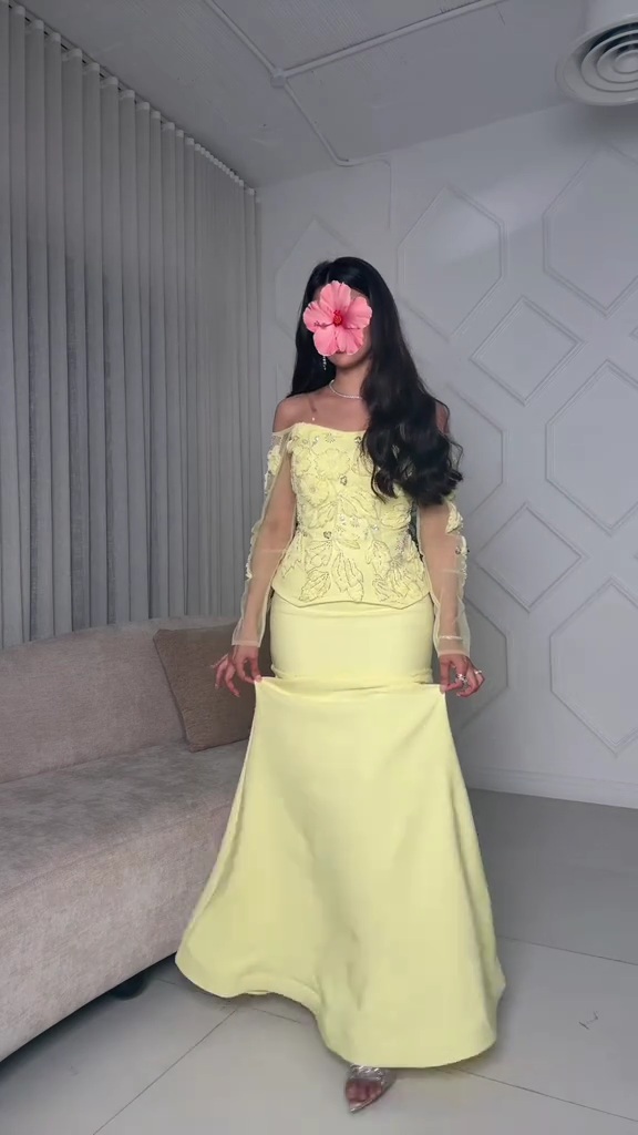 الفستان يتميز بالجزء العلوي المطرز بتطريزات ناعمة وزخارف زهرية، مما يمنحكِ إطلالة رقيقة وفاخرة. الأكمام الشفافة تضيف لمسة من الرقي والجمال، بينما تضفي التفاصيل اللامعة لمسات من التألق التي تبرز جمال الفستان.