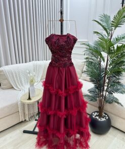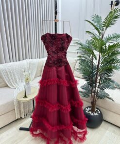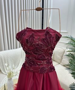 فستان أنيق كلاسيكي عتيق ينبض بالفخامة والأنوثة، يجمع بين الرقي الكلاسيكية والتفاصيل الكلاسيكية اللافتة. يتميز دون أكمام (سترابلس) مطرز بتفاصيل لامعة ومحشو يدويًا من الفخامة والصدمة