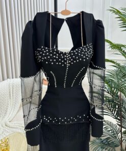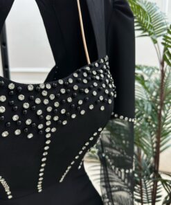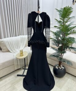 تألقي بإطلالة مبهرة مع هذا العامل الأسود، المصمم بقصة سريعة تُبرز جمال القوام. تتميز بتطريز خاص من الخرز اللامع على منطقة الصدر والأكمام ويلامس، مع تفاصيل دقيقة من الخرز المتدلي الممتلئ بالكامل ومتحركة. يلامس الاكمام تطريزات مفاهيمية تتعلق بالنسيج أنثوية جذابة، بينما يأتي المخملي الفاخر ليعزز من فخامة الإطلالة. مثالية للمناسبات والحفلات الخاصة.