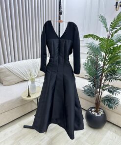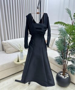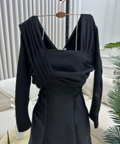 يُجسد هذا الموضوع الأسود مفهوم التجمع والبساطة الفاخرة، حيث يجمع بين القصّة والتفاصيل التاريخية التي تُبرز أنوثة المرأة إذاعةقة ورقي. يتميز عامله الانسيابي متوسّط الوزن، والذي ينسدل بنعومة من الخصر ليمنح القامة توازناً وجذاباً. أما الجزء الأمامي، فم زود بأكمام طويلة وتفصيل متلألئ عند منطقة يضفي بعدًا فنيًا ويبرز الطيف بشكل جمالي.