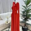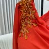 يتميز هذا الفستان الفاخر بلونه الأحمر الجريء الذي يعكس قوة الشخصية وأناقة الحضور. صُنع من قماش شيفون خفيف وانسيابي، مما يضفي عليه طابعاً رقيقاً ومفعماً بالأنوثة.