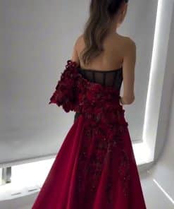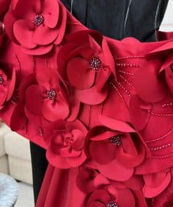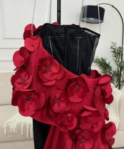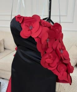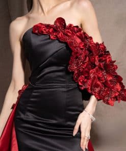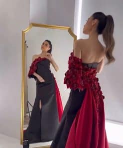 فستان أنيق وجريء يجمع بين اللونين الأسود والأحمر، مما يضفي لمسة درامية وجذابة. بسبب ضيق ويأخذ قصة طويلة مفعمة بالأناقة