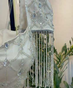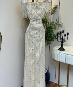 يتميز الفستان بقصة محددة تبرز جمال القوام، مع تطريز كريستالي فاخر يغطي التصميم بالكامل ليمنحك بريقًا ساحرًا تحت الإضاءة. الأكتاف مزينة بتفاصيل شراريب لامعة تضيف لمسة درامية أنيقة، بينما تنسدل التنورة بانسيابية راقية تعكس الفخامة في كل خطوة.