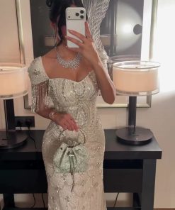 يتميز الفستان بقصة محددة تبرز جمال القوام، مع تطريز كريستالي فاخر يغطي التصميم بالكامل ليمنحك بريقًا ساحرًا تحت الإضاءة. الأكتاف مزينة بتفاصيل شراريب لامعة تضيف لمسة درامية أنيقة، بينما تنسدل التنورة بانسيابية راقية تعكس الفخامة في كل خطوة.