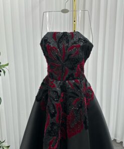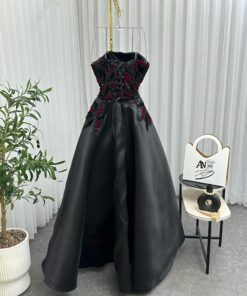 فستان الساحر يجمع بين الفخامة والرقي، مصنوع من قماش ساتان أسود فاخر يمنحه لمعة أنيقة ولمسة ناعمة. يتميز بقصّة “سترابلس” جذابة تُبرز جمال الكتفين والرقبة، مع خصر محدد يُضفي مظهراً أنثوياً راقياً.