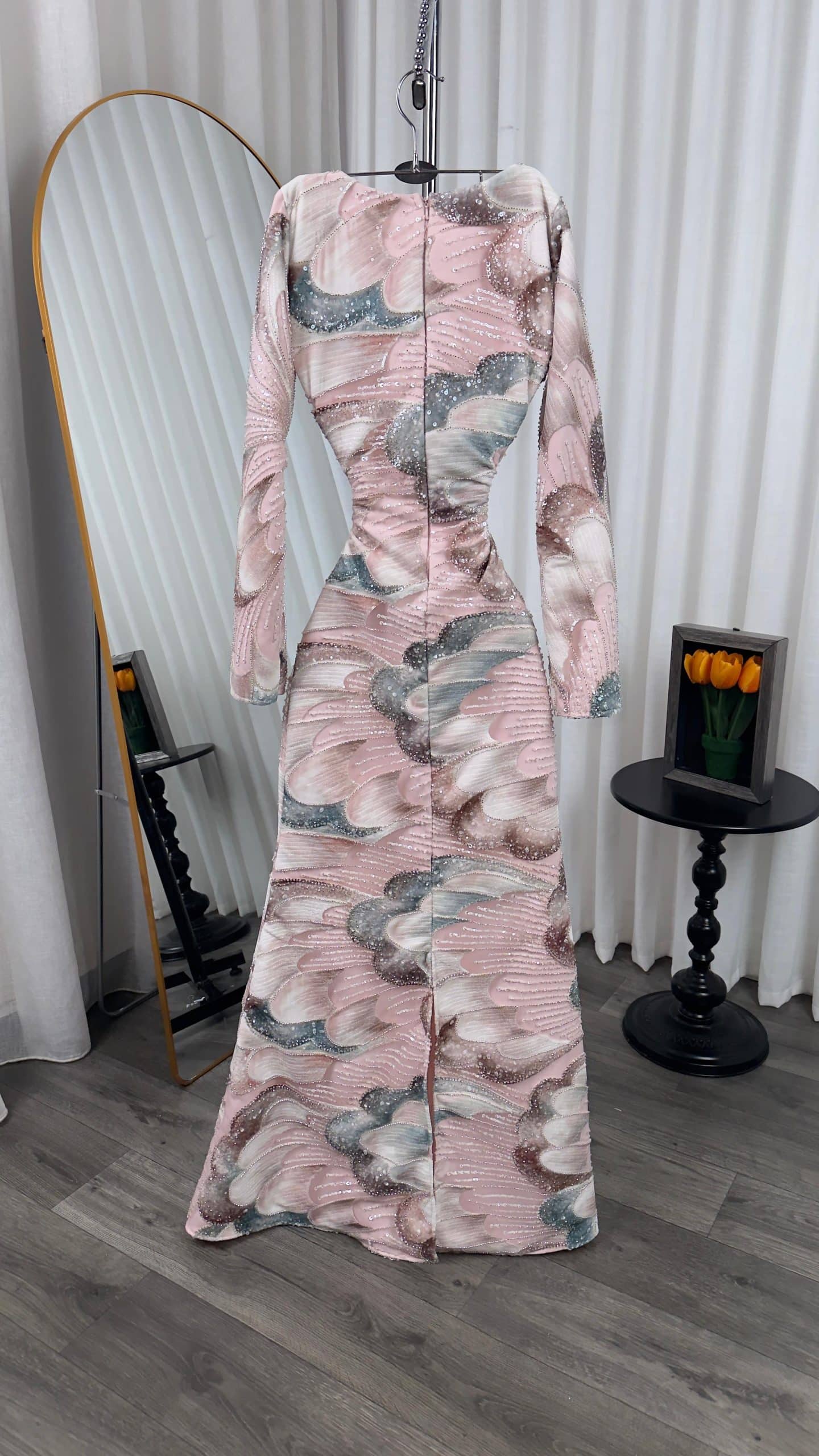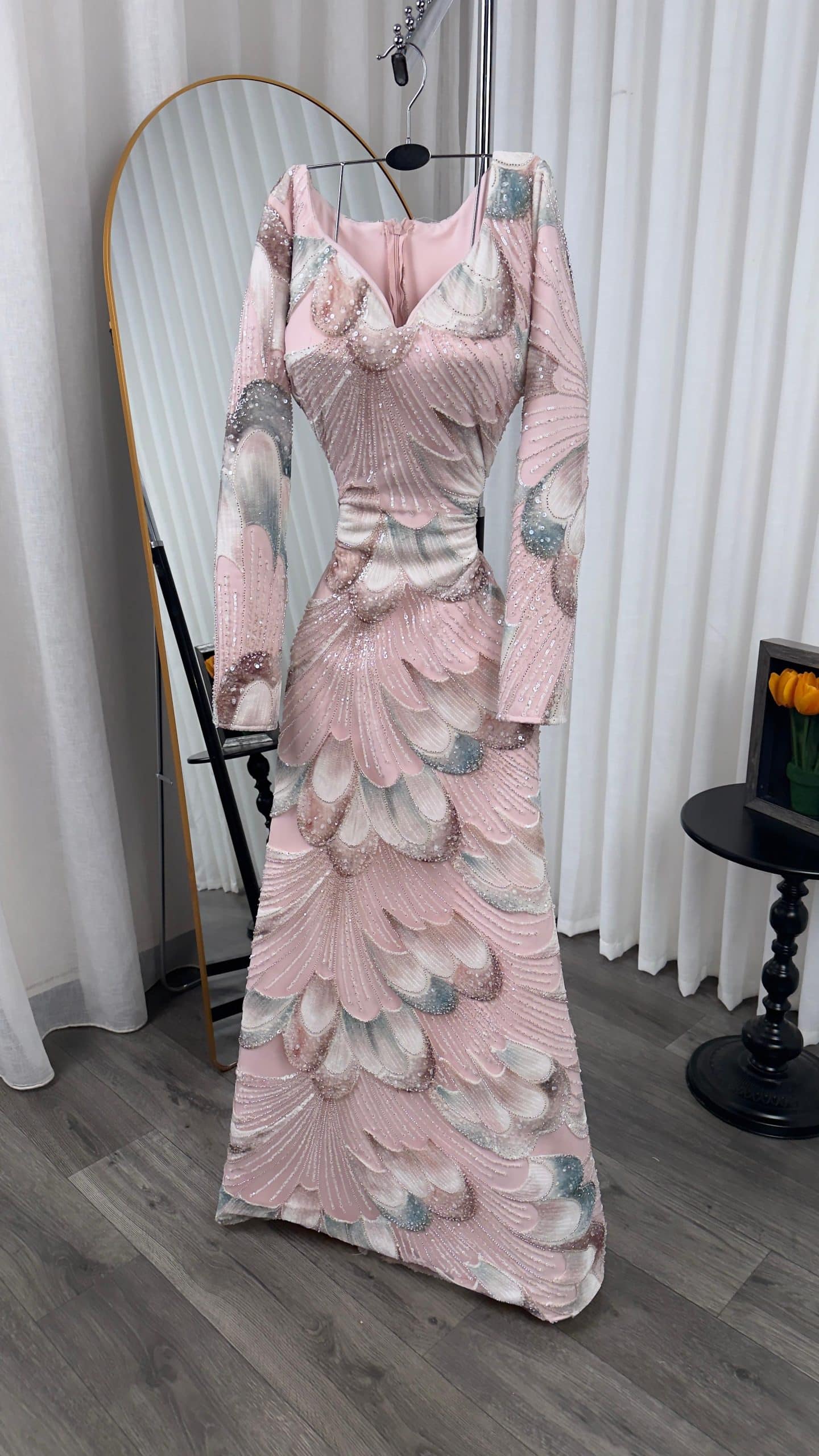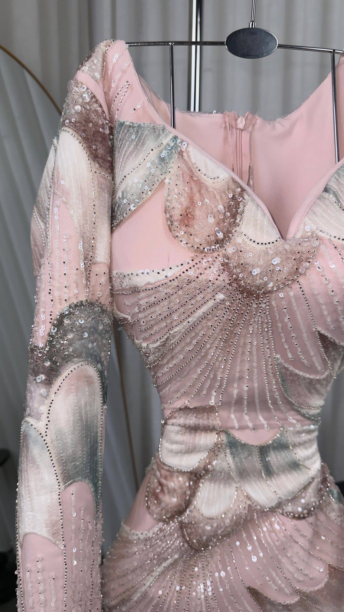 اختاري الأناقة الهادئة مع هذا الفستان الساحر باللون الوردي الناعم، المصمم ليمنحك إطلالة راقية ومميزة في جميع مناسباتك. يتميز بتفاصيل تطريز فاخرة مستوحاة من أشكال فنية ناعمة تمنح الفستان لمسة فخمة وبريقاً أنيقاً تحت الإضاءة.