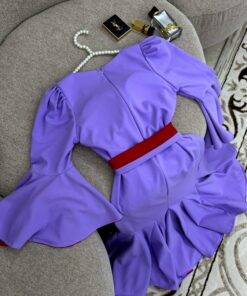 فستان أنيق ومميز بلونه البنفسجي الفاتح مع لمسات من اللون الأحمر، مما يمنحه طابعًا عصريًا وجذابًا. تصميمه يتميز بقصة ضيقة عند الخصر تبرز جمال القوام، مع أكمام طويلة تنتهي بتوسعة خفيفة لإضفاء لمسة أنثوية ناعمة.