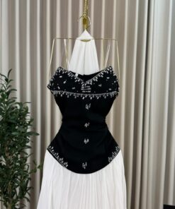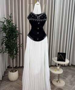 الفستان يتميز بتصميمه الذي يتكون من جزئين رئيسيين، الجزء العلوي الأسود الذي يحمل لمسة من الفخامة بفضل التطريزات اللامعة التي تزين منطقة الصدر، مما يعزز من جمال الإطلالة. أما الجزء السفلي، فيأتي بتصميم تنورة بيضاء من القماش المتدفق التي تنسدل بشكل متناسق وأنيق، مما يضفي على الفستان لمسة من الأنوثة العصرية.