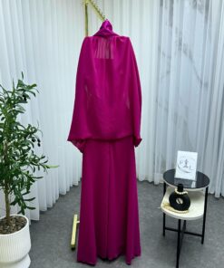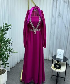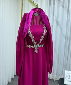 الفستان مصنوع من قماش انسيابي فاخر يمنحه حركة رشيقة ومظهرًا متألقًا، وهو مزوّد بشال من نفس القماش يضفي لمسة ملكية راقية. الياقة المستقيمة مع الأكمام المكشوفة تُضفي على التصميم طابعًا راقيًا يلائم المناسبات الفاخرة كحفلات الزفاف أو السهرات الخاصة.