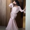 يتميز الفستان بقصة علوية أنثوية بحمالات عريضة وياقة ناعمة تبرز جمال القوام بأسلوب راقٍ، مع خصر محدد يمنحك تناسقًا مثاليًا. أما التنورة فتأتي بطبقة دانتيل فاخرة بنقوش أنيقة وحافة شفافة تضيف لمسة رومانسية وحركة انسيابية جذابة أثناء المشي.