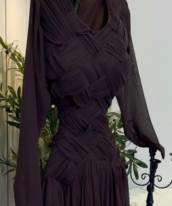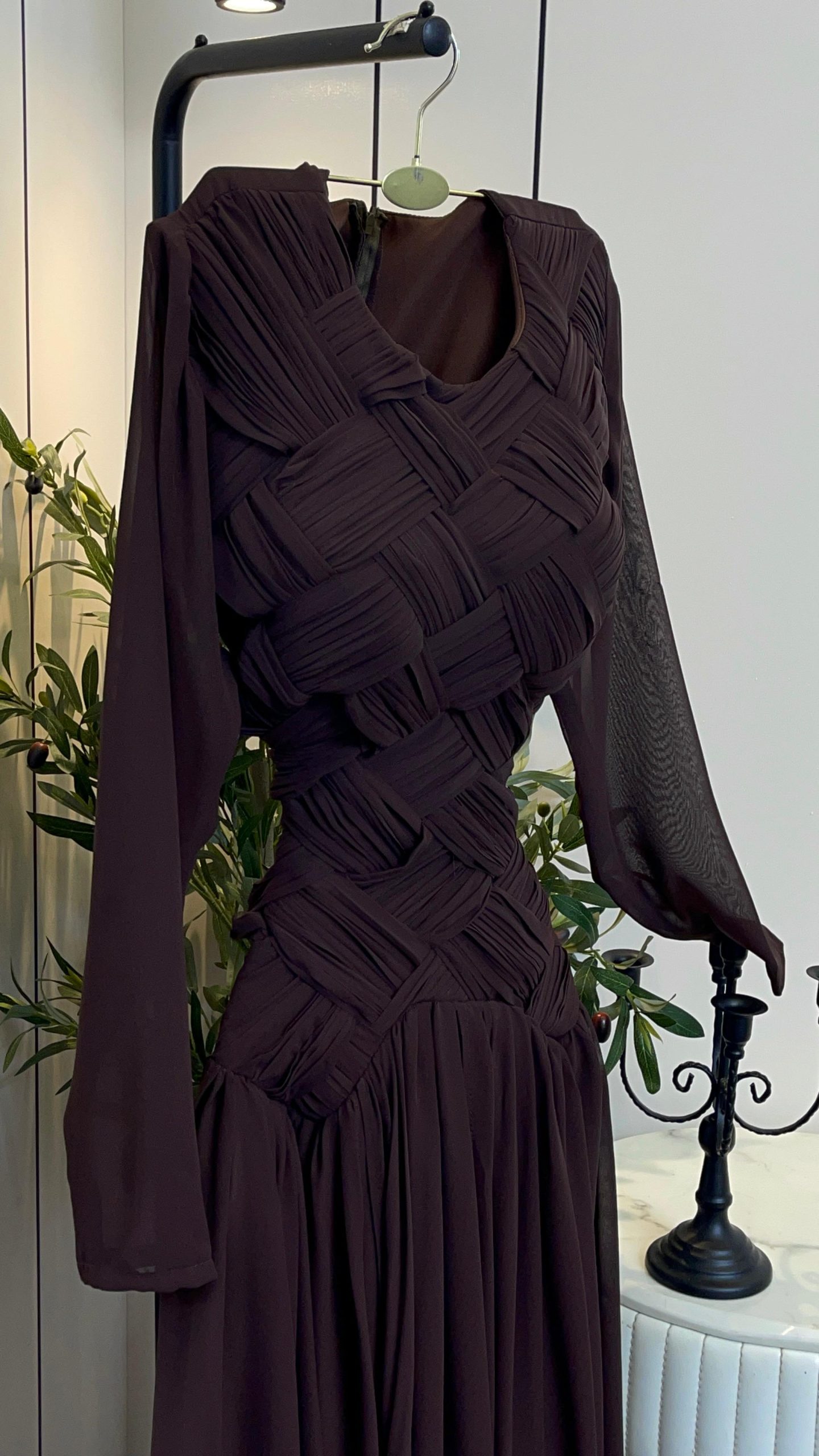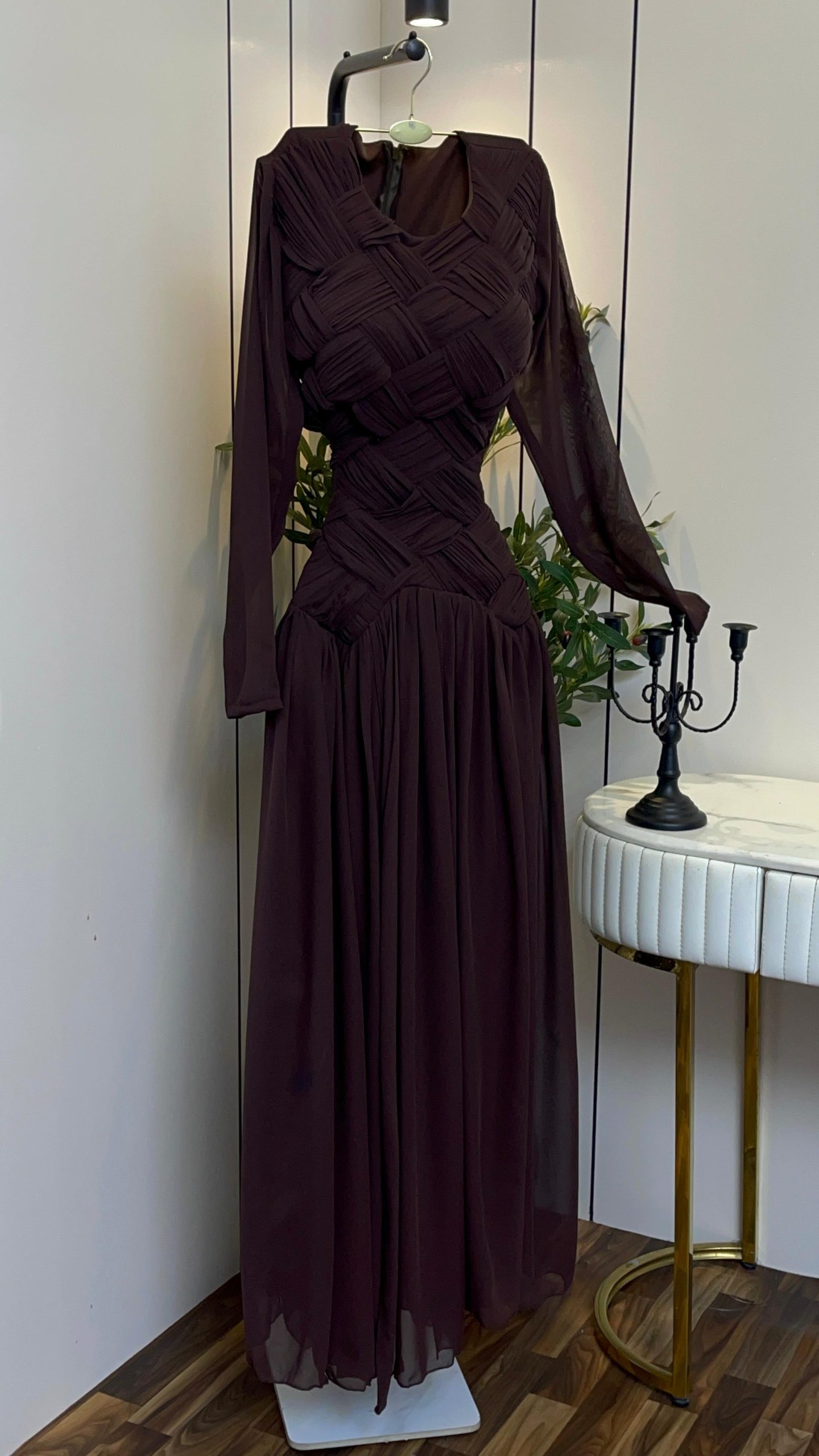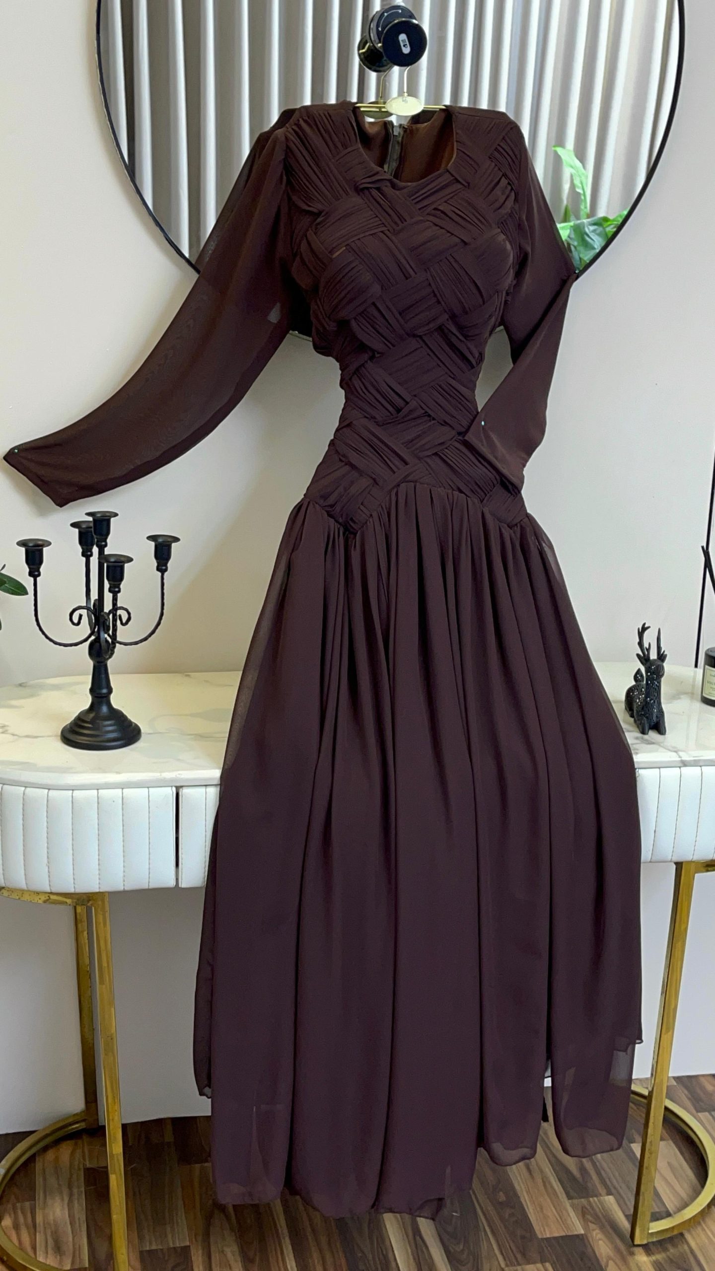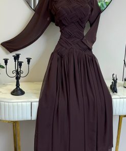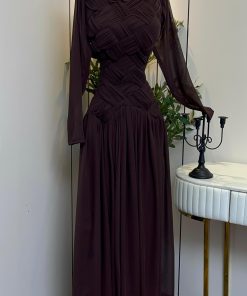 اختاري الفخامة الهادئة مع فستان بني طويل بتفاصيل درابيه راقية من روزيتا السعودية، تصميم يجمع بين الأناقة الكلاسيكية والطابع العصري المحتشم.