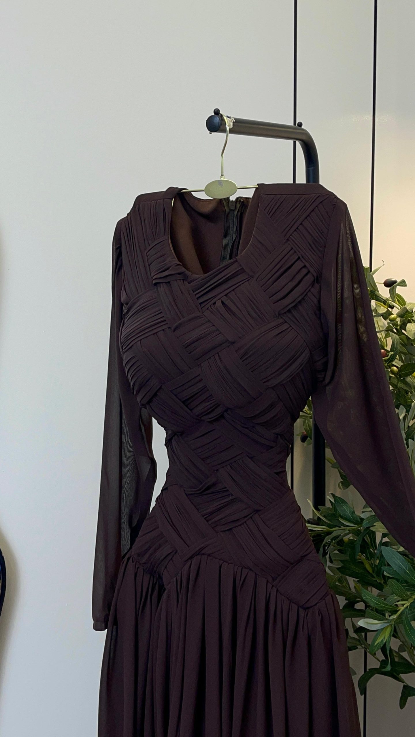 يتميز الفستان بقصة علوية مميزة بتفاصيل متداخلة (درابيه) تبرز جمال القوام بأسلوب أنثوي راقٍ، مع أكمام طويلة شفافة تضيف لمسة فخامة ناعمة. تنسدل التنورة الطويلة بانسيابية لتعطيك حضورًا ملكيًا في كل خطوة.
