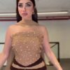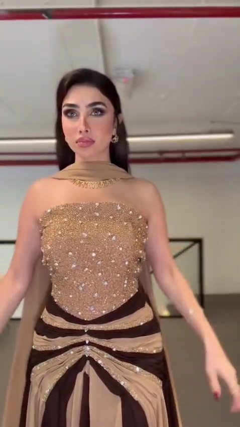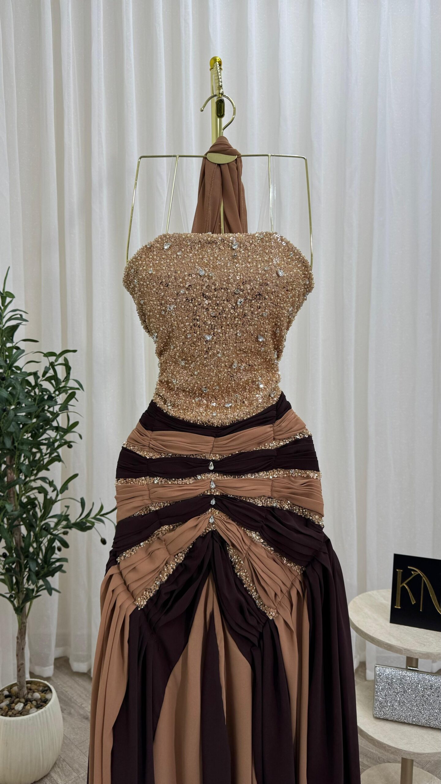 الفستان يتألق بتطريزات لؤلؤية مبهرة على الجزء العلوي، مما يضيف لمسة من السحر والفخامة. الجزء السفلي، المصمم من أقمشة مزمومة بألوان دافئة من البني والذهبي، ينساب برقة لتكمل جمال التصميم. يُظهر الشكل العام جمال القوام بشكل رائع، ويعكس الأنوثة بكل أناقة.