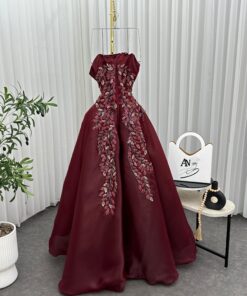 فستان ملكية عنابي مطرز بدون أكتاف أنيق وفخم