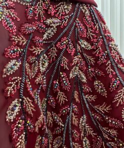 فستان أنيق أنيق عنابي فاخر فريد بدون أكتاف (سترابلس)، يتميز بقصة صدر مطرزة بتفاصيل فاخرة من الخرز والترتر البراق على أوراق متداخلة بالكامل وغير من الفخامة