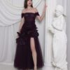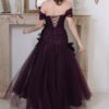 يأتي الفستان بقصّة منفوشة متوسطة الطول، مصنوعة من طبقات التول الفاخر التي تمنحه حجمًا أنيقًا وانسيابية ساحرة. الجزء العلوي مصمم بتكسيرات دقيقة وتطريزات ناعمة تزين الصدر، بينما تضفي الأكمام المنفوخة لمسة رومانسية ناعمة تزيد من جمال الإطلالة.