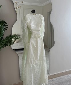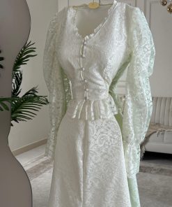 يتميز الفستان بقصة طويلة انسيابية من الدانتيل الفاخر بالكامل، مع أزرار أمامية أنيقة تضيف لمسة كلاسيكية جذابة. الأكمام الواسعة الشفافة تمنح التصميم طابعًا ملكيًا راقيًا، بينما يبرز الحزام عند الخصر جمال القوام بأسلوب ناعم ومحتشم.