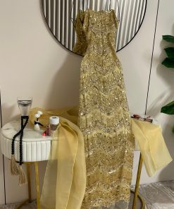 الخامة: قماش فاخر يضمن لكِ الراحة والأناقة طوال السهرة.استمتعي بإطلالة ساحرة مع فستان روزيتا الذهبي وتميزي في كل مناسبة.