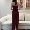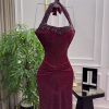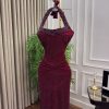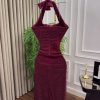 يتميز هذا الفستان بلونه العنابي العميق الذي يعكس الفخامة والرقي. تم تغطية منطقة الصدر وحواف الفستان بحبات الأحجار اللامعة التي تبرز جمالية التصميم وتعكس الضوء بطريقة ساحرة. الفستان يأتي بتصميم عصري وجذاب مع حزام عنق مزخرف يضيف لمسة من الأناقة الكلاسيكية.