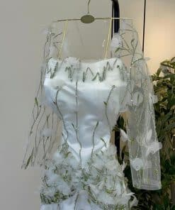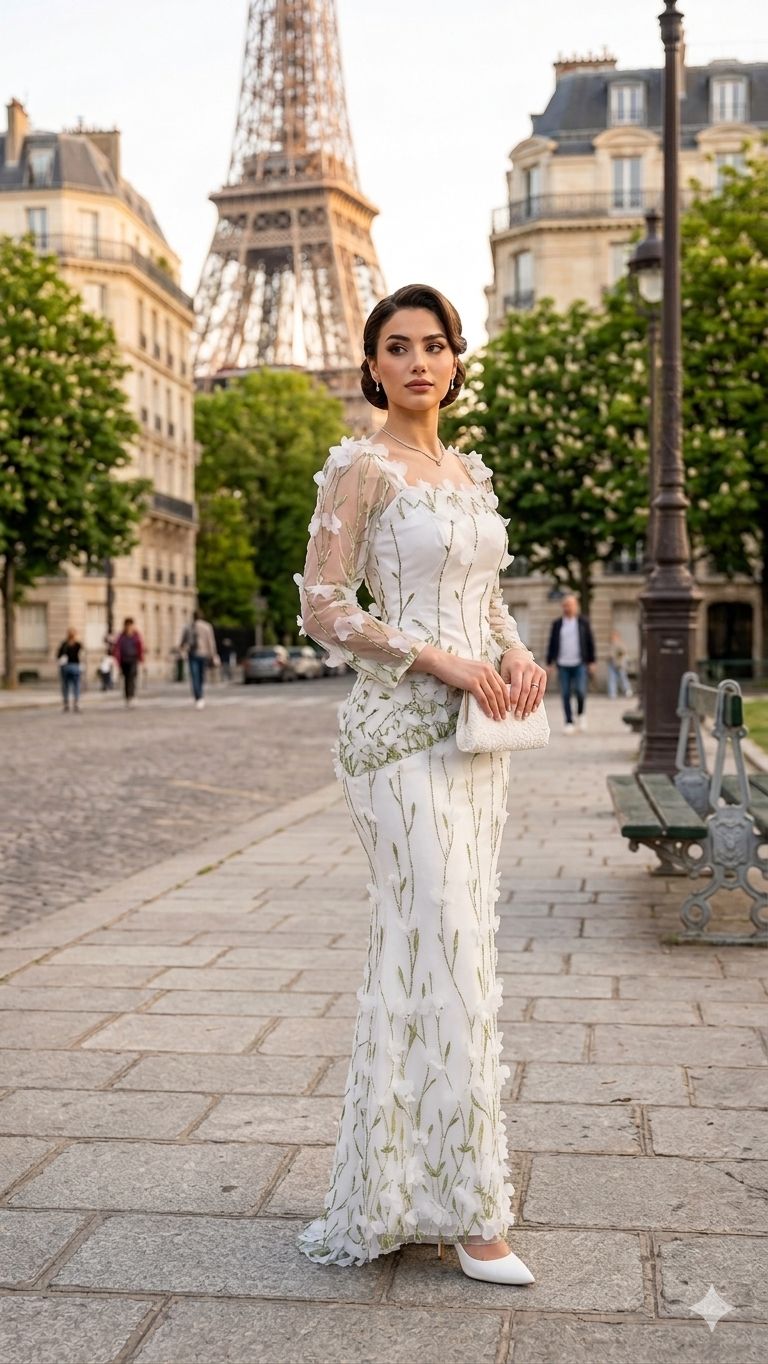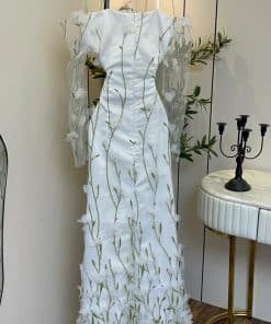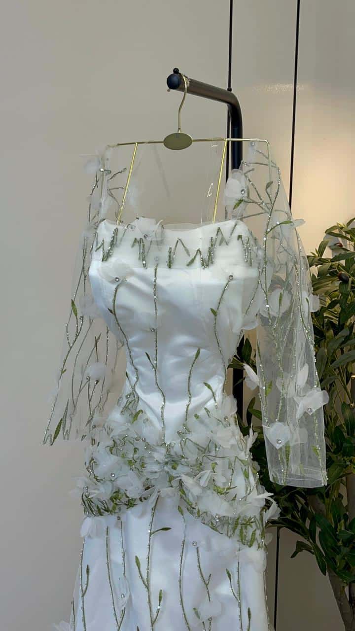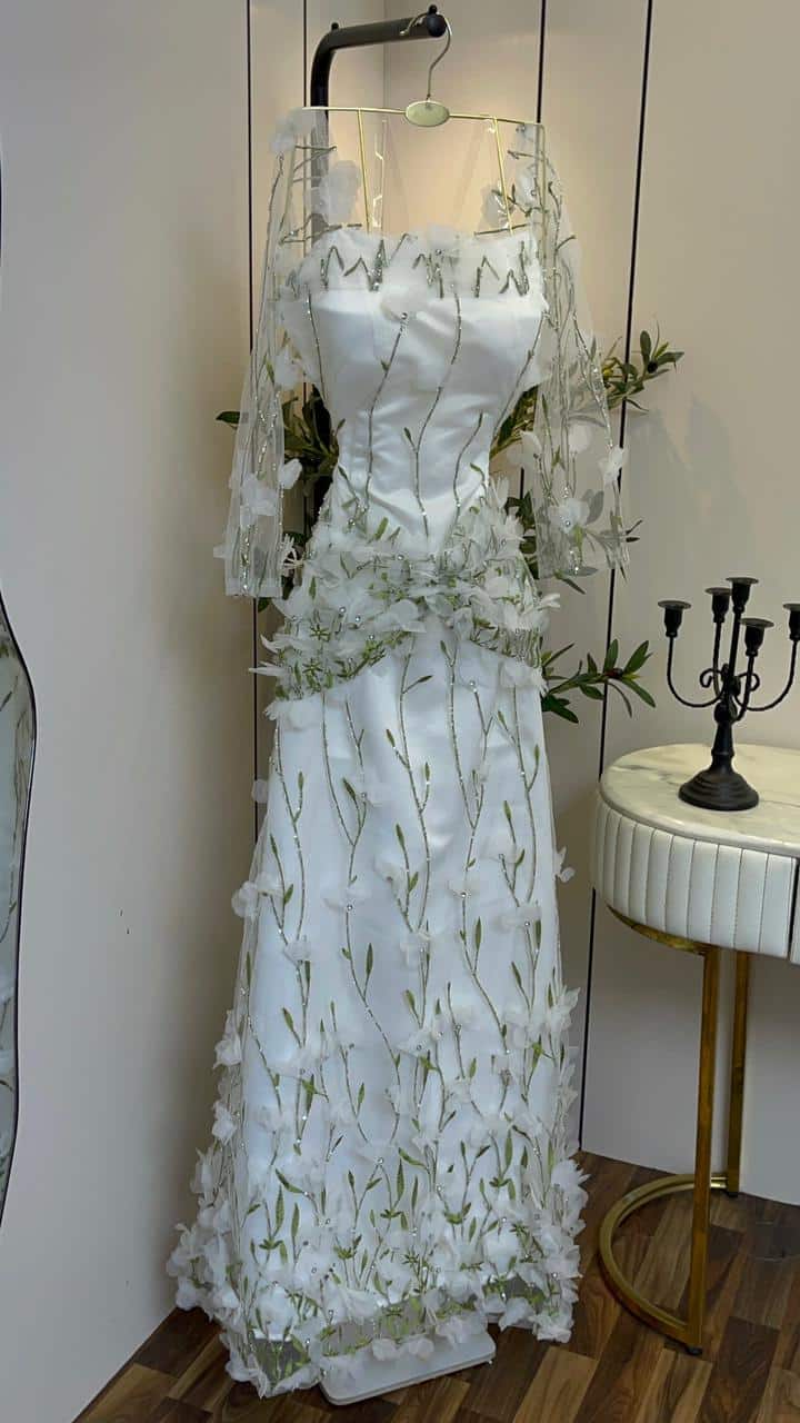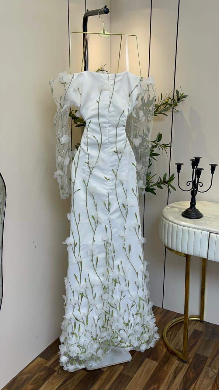إطلالة راقية مليئة بالنعومة والفخامة مع هذا الفستان الأبيض المصمم بتفاصيل أنيقة تناسب ذوق المرأة الراقية في السعودية. يتميز الفستان بتطريز ناعم مستوحى من الطبيعة يضفي لمسة فنية مميزة على التصميم.