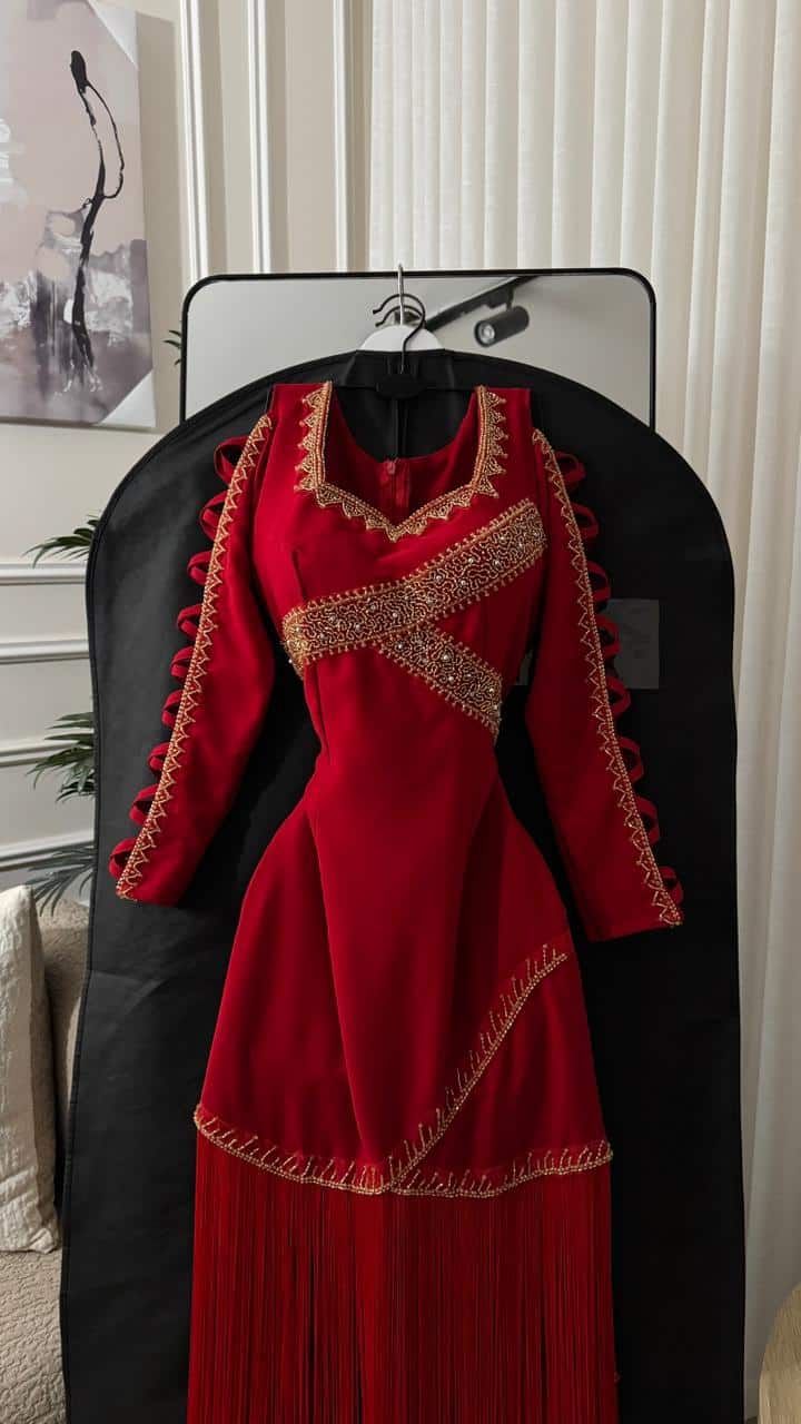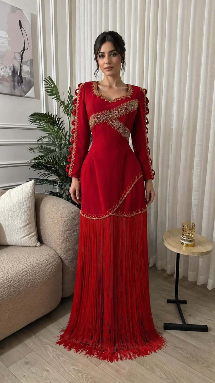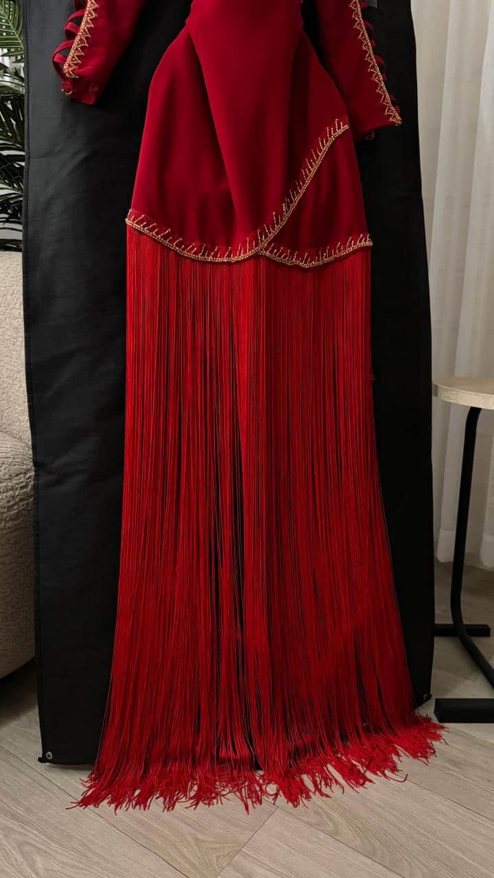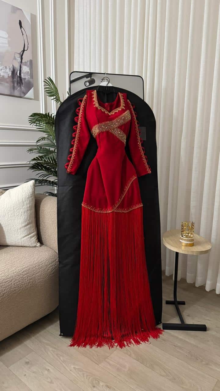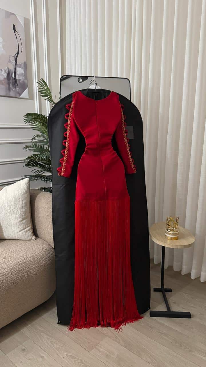 فستان سهرة أحمر بتطريز ذهبي وشراشيب فاخرة