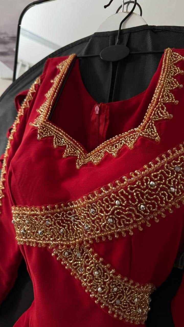 فستان سهرة أنيق بلون أحمر جريء يعكس الفخامة والأنوثة، مصمم بقصة مميزة تبرز جمال القوام. يتميز الفستان بأكمام طويلة مع تفاصيل مفتوحة على الجانبين تضيف لمسة عصرية جذابة، وياقة أنيقة مزينة بتطريز ذهبي فاخر.