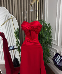 فستان سهرة أحمر بقصّة أنيقة وشق أمامي – متجر روزيتا