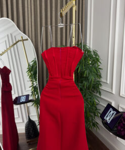 فستان سهرة أحمر بقصّة أنيقة وشق أمامي