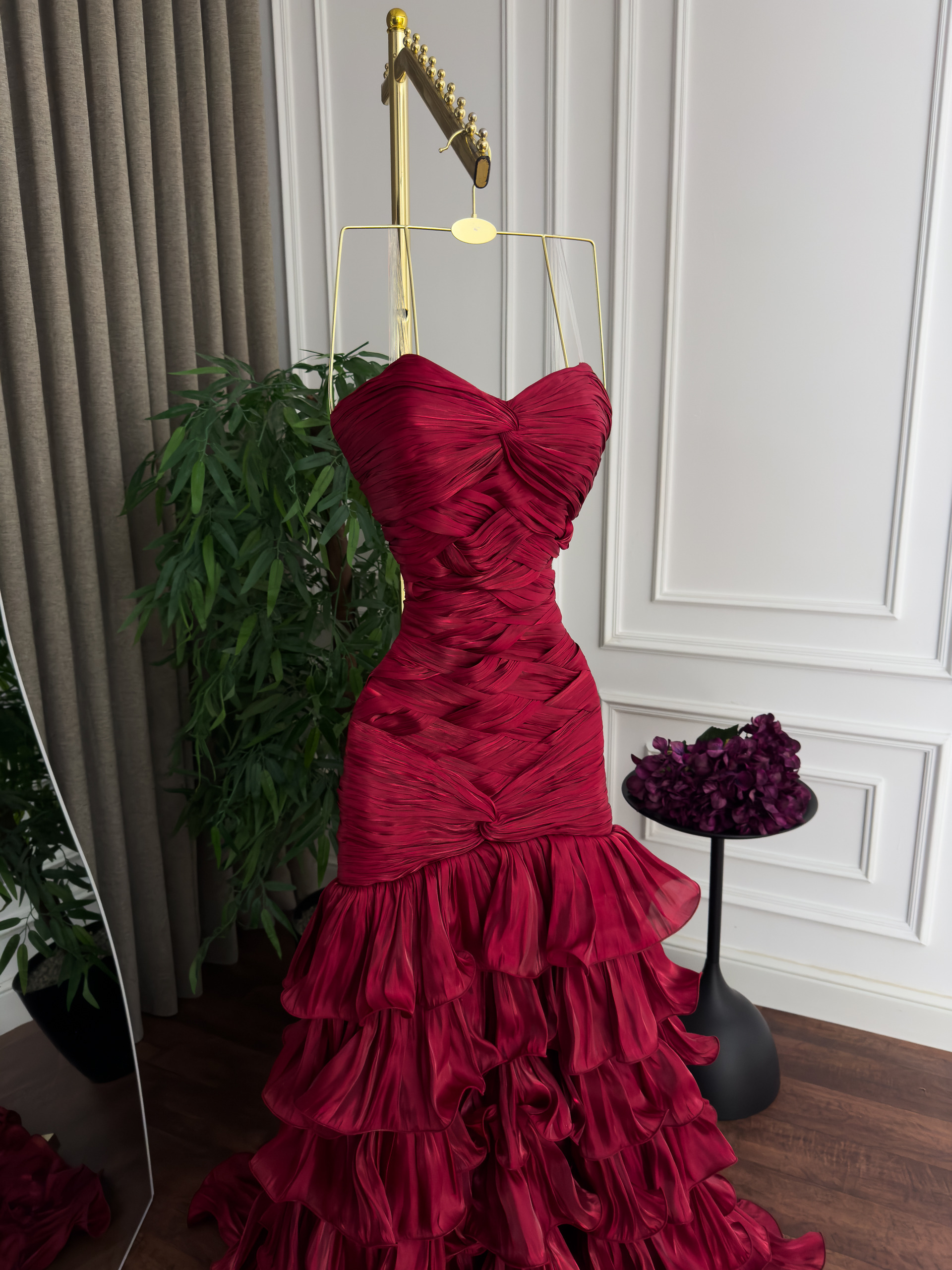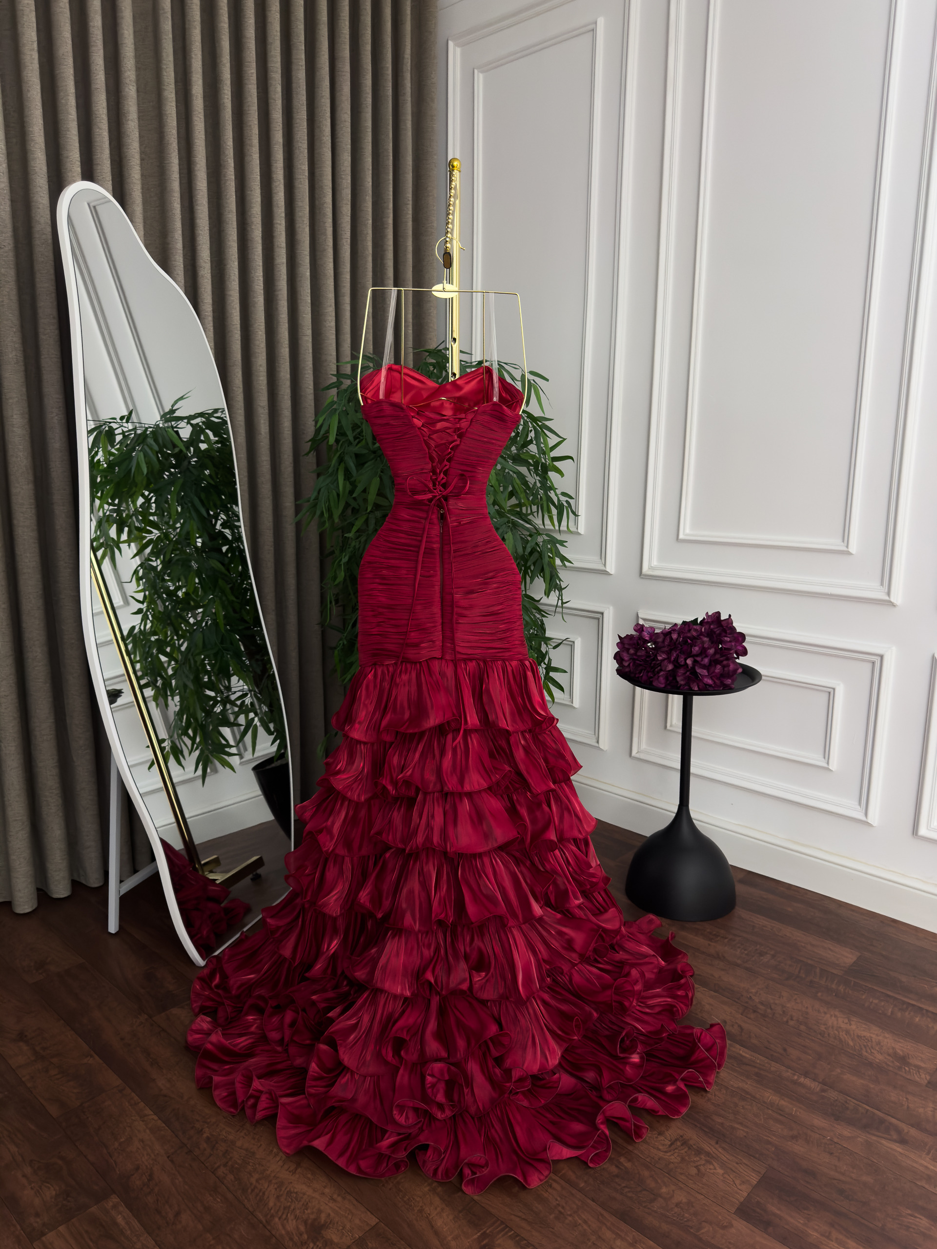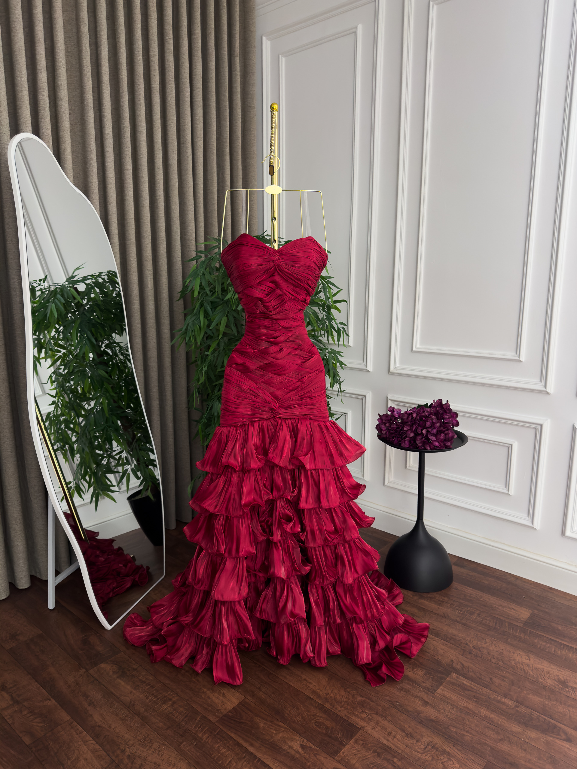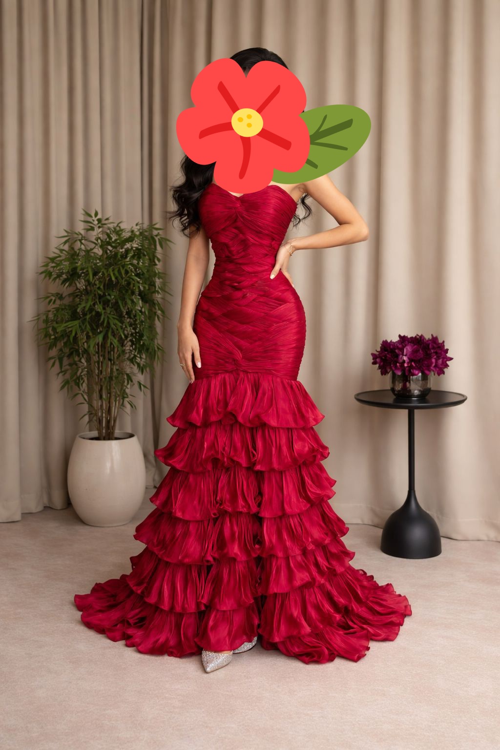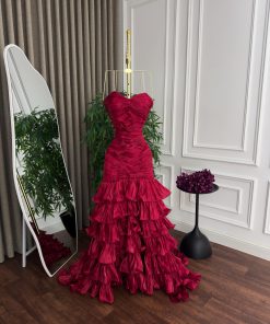 فستان سهرة أحمر جذاب بطبقات شيفون وتصميم كورسيه جذاب | متجر روزيتا السعودية