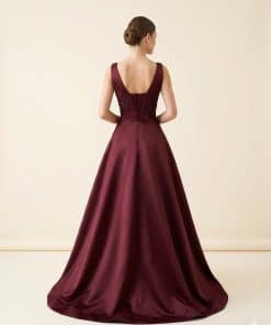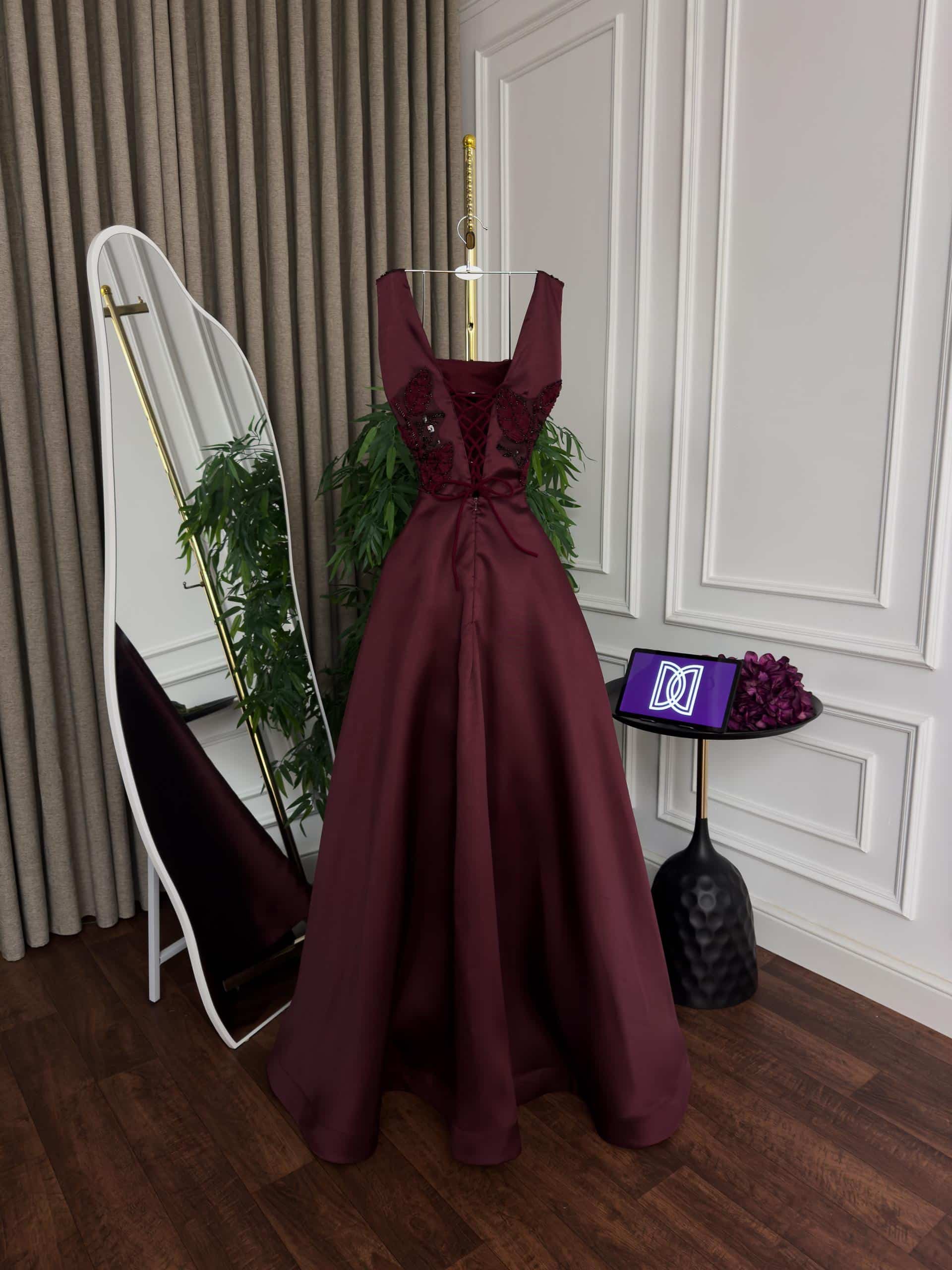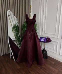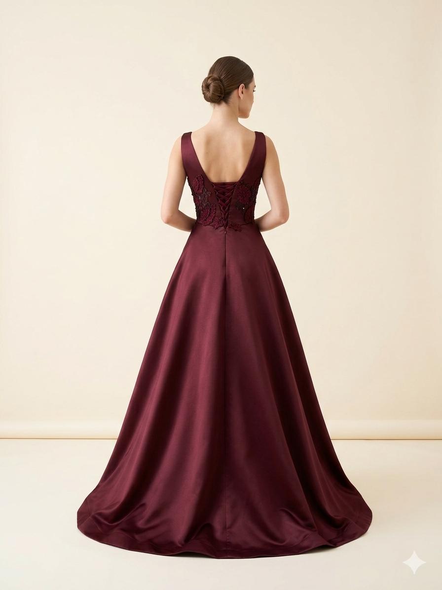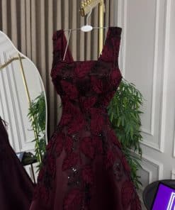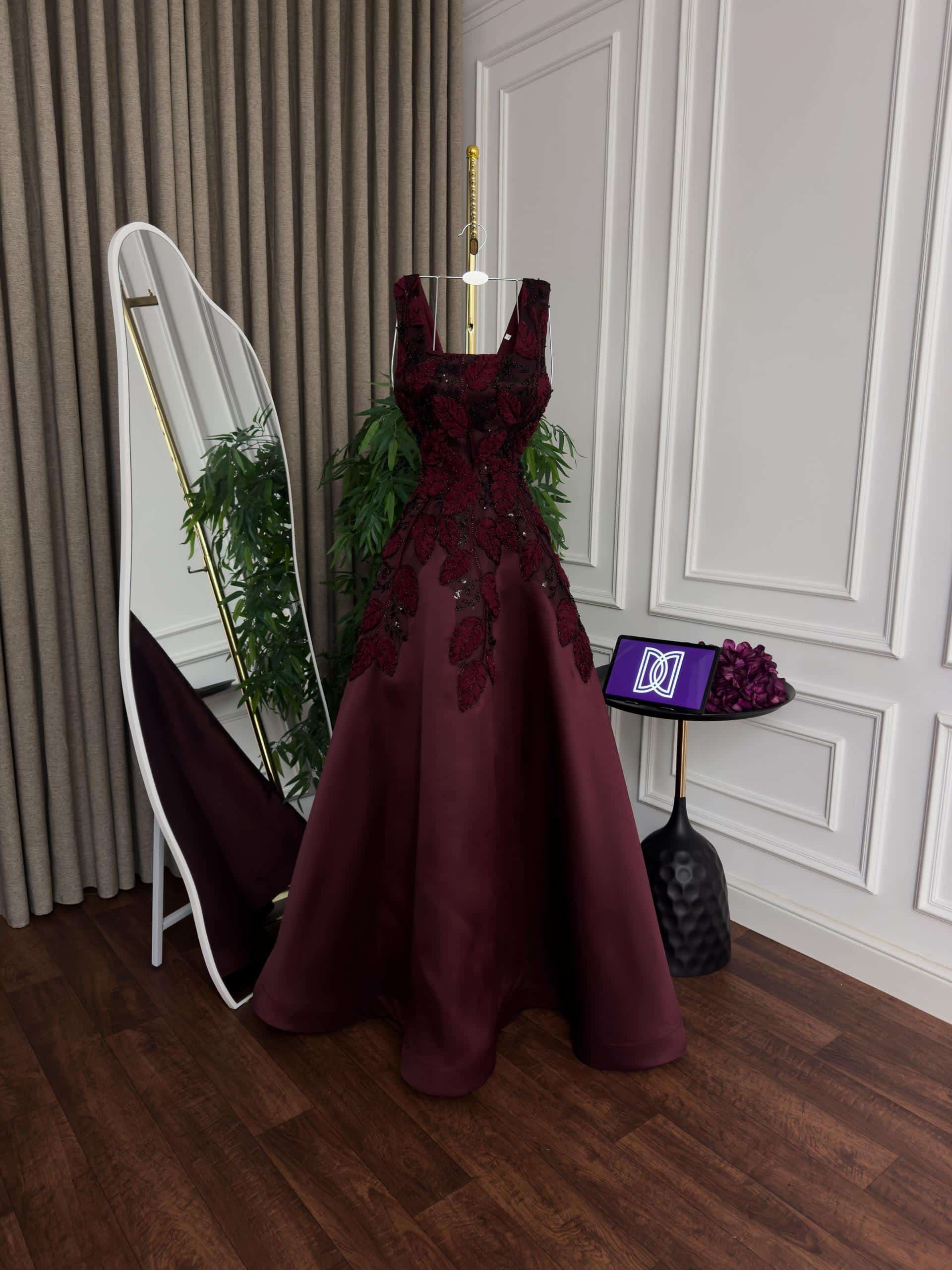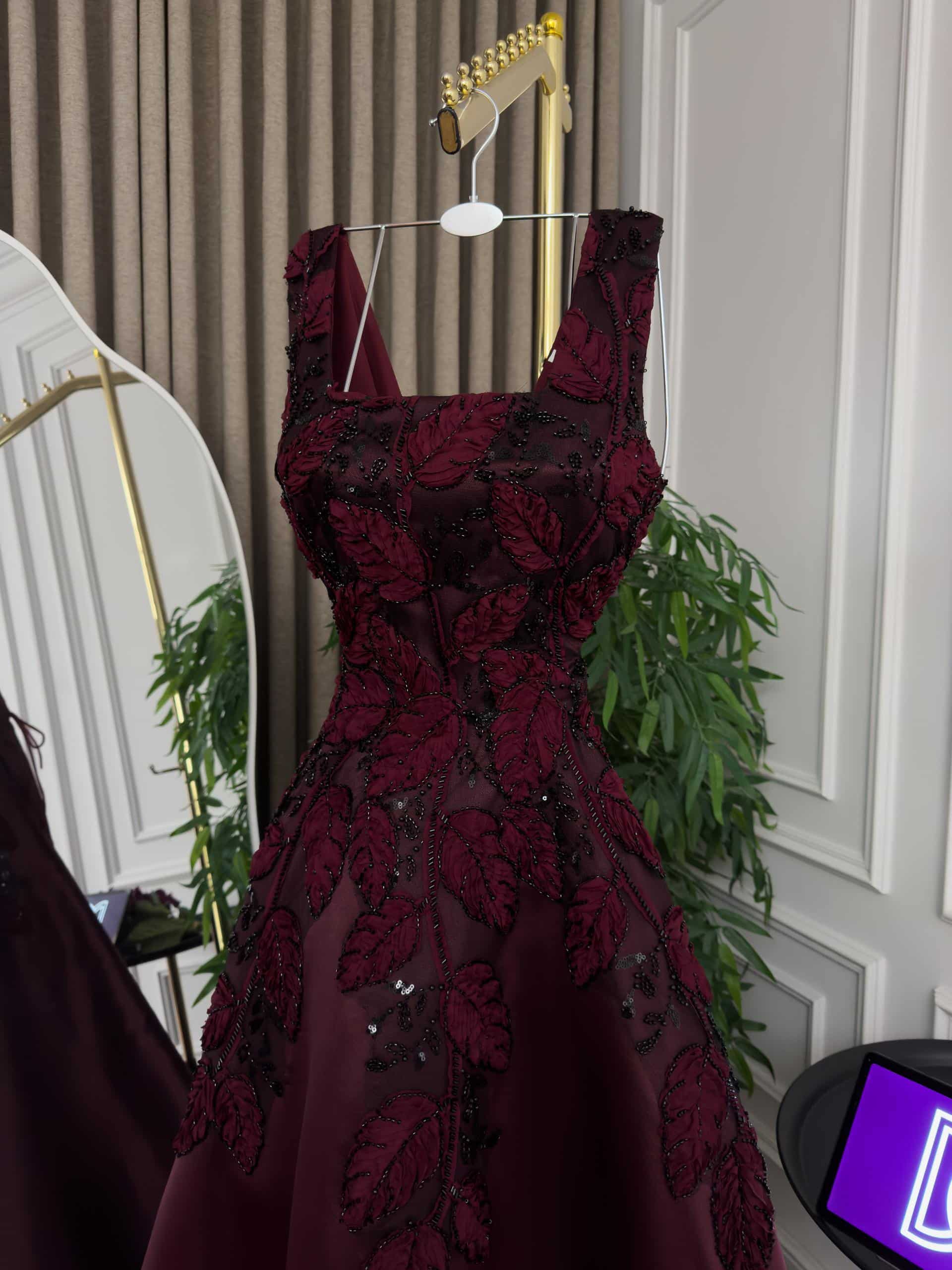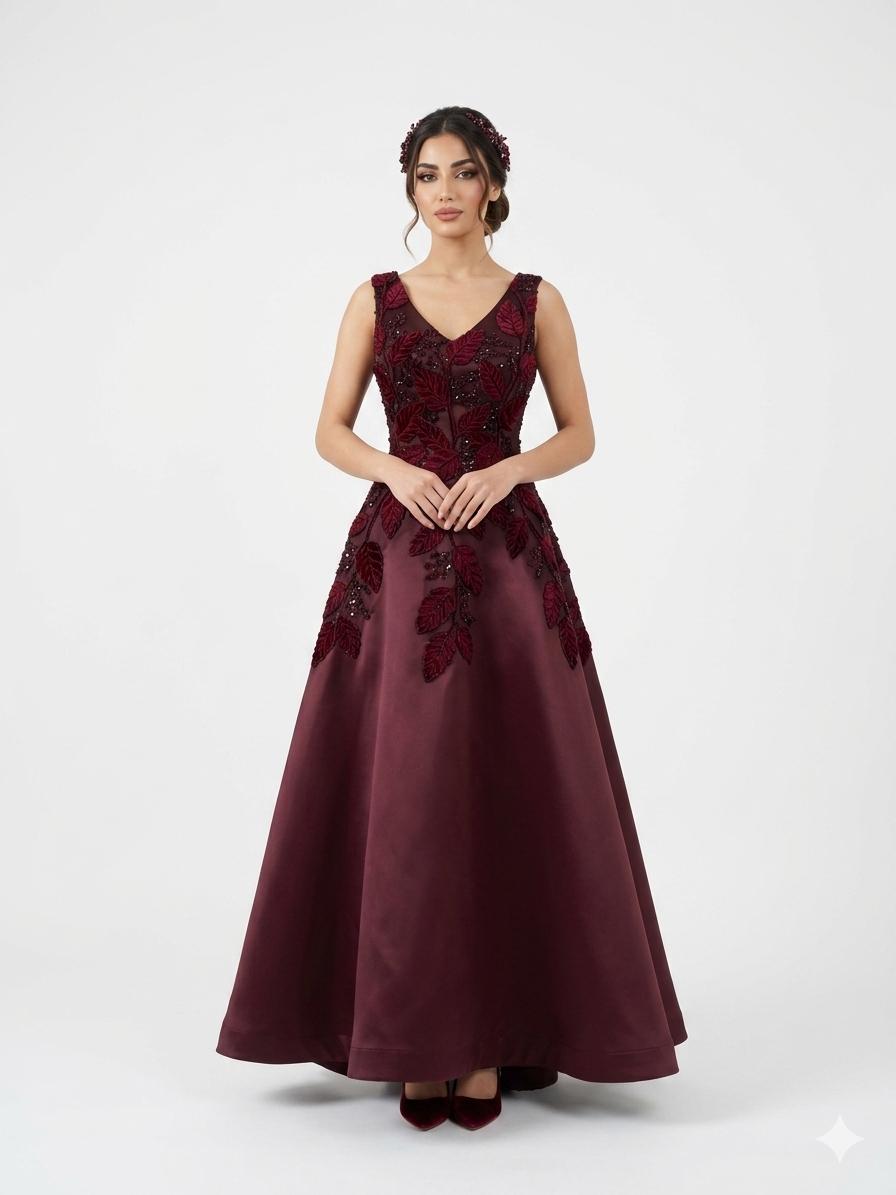 إطلالة ساحرة تجمع بين الفخامة والرقي مع هذا الفستان المميز باللون الأحمر الداكن الجذاب. يتميز التصميم بقصة صدر مربعة أنيقة مع أكتاف عريضة تمنح ثباتاً وجمالاً في الارتداء، بينما يزين الجزء العلوي تطريز دانتيل فاخر بأوراق بارزة ولمسات براقة تضيف فخامة راقية.