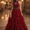 فستان سهرة أحمر داكن منفوش بتطريز دانتيل فاخر
