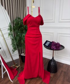 استمتعي بأناقة لا مثيل لها مع فستان السهرة الأحمر الطويل بتصميم أوف شولدر وشق أمامي جريء. مصنوع من قماش فاخر ينسدل بانسيابية ليبرز قوامك بأسلوب راقٍ، ومثالي للحفلات والمناسبات الخاصة